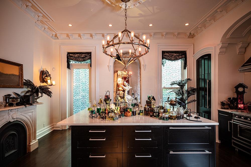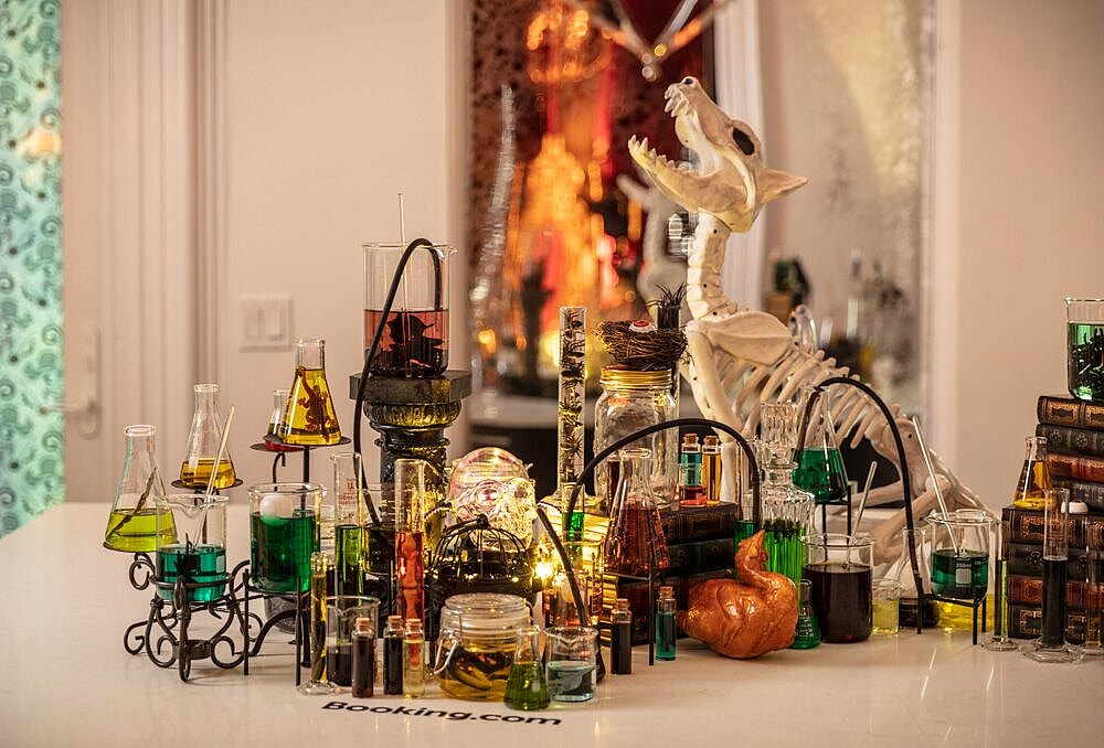 The kitchen is stocked with colorful potions, lots of (fake) insects, animal skeletons, and actual snacks, of course.