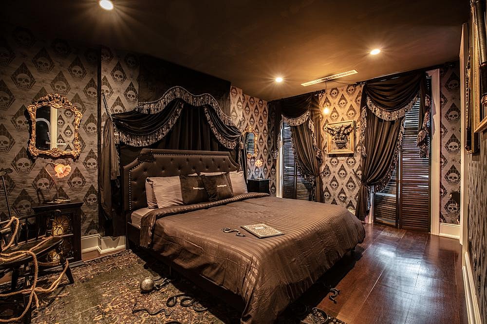 Upstairs, Gomez and Morticia’s bedroom is just as dark and black as you’d expect with skulls adorning the wallpaper and other gothic decor.