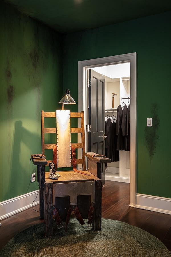 Wednesday’s bedroom has a guillotine headboard, an electric chair, ouija board, and an unsettling dollhouse.