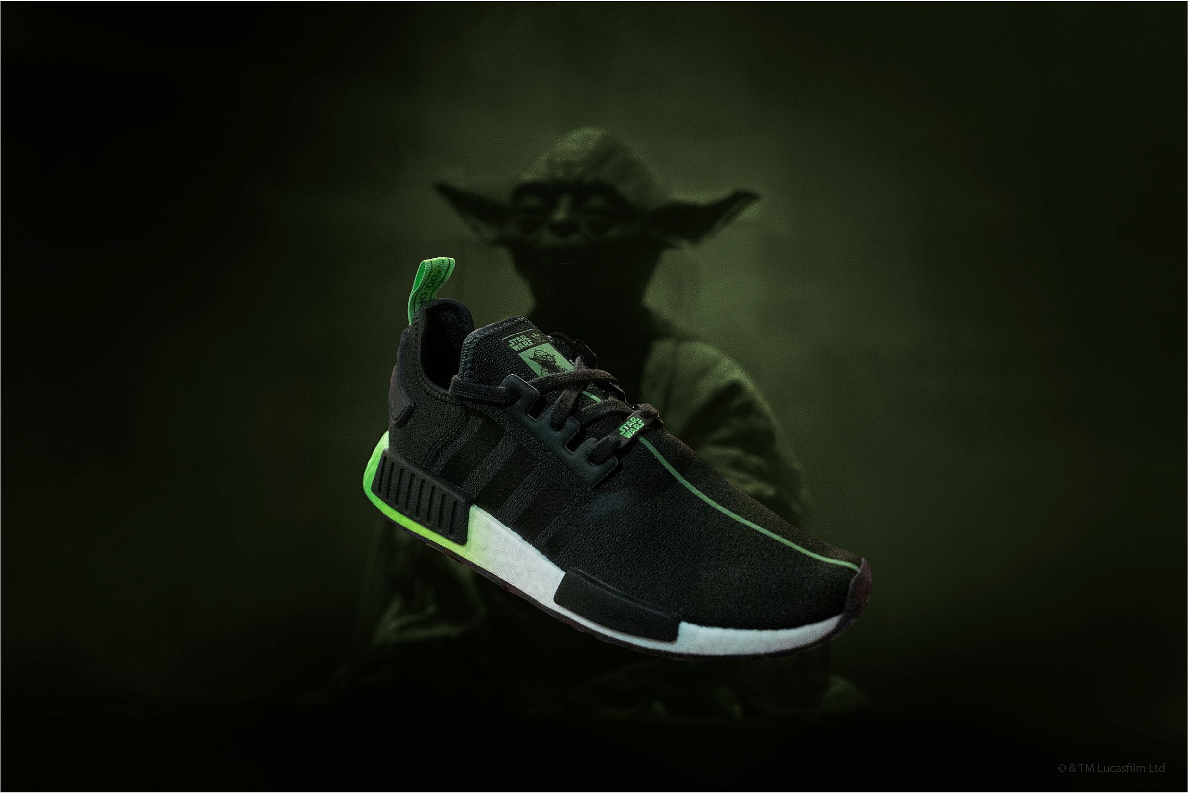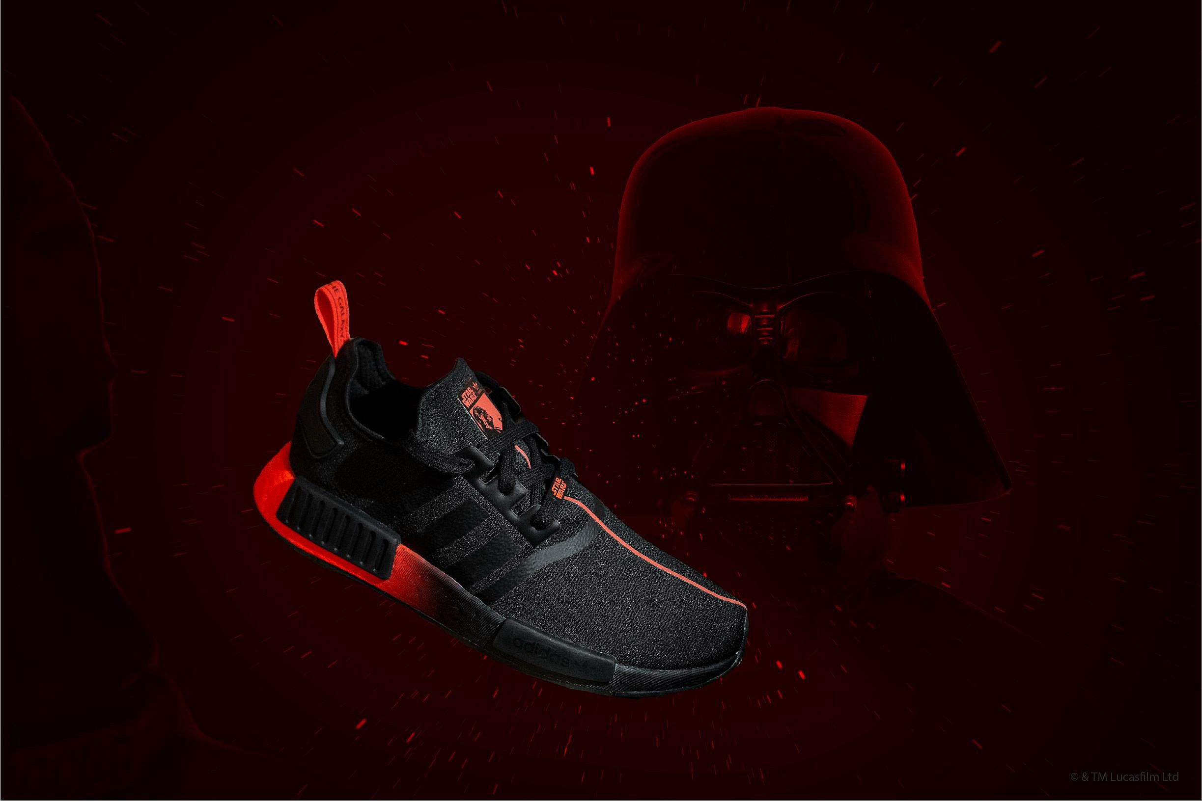 Light and dark sides of the Force are repped over two popular silhouettes. Two juxtaposed NMDs with menacing black bases, light saber-like stripes and custom stamped logos pay tribute to Jedi Master Yoda and Darth Vader. Hypebeast notes that Yoda’s features dark green accents and his famous “Do. Or do not. There is no try” phrase, while Vader’s features bold red coloring and the words “Join me and we can rule the galaxy” on the heel.