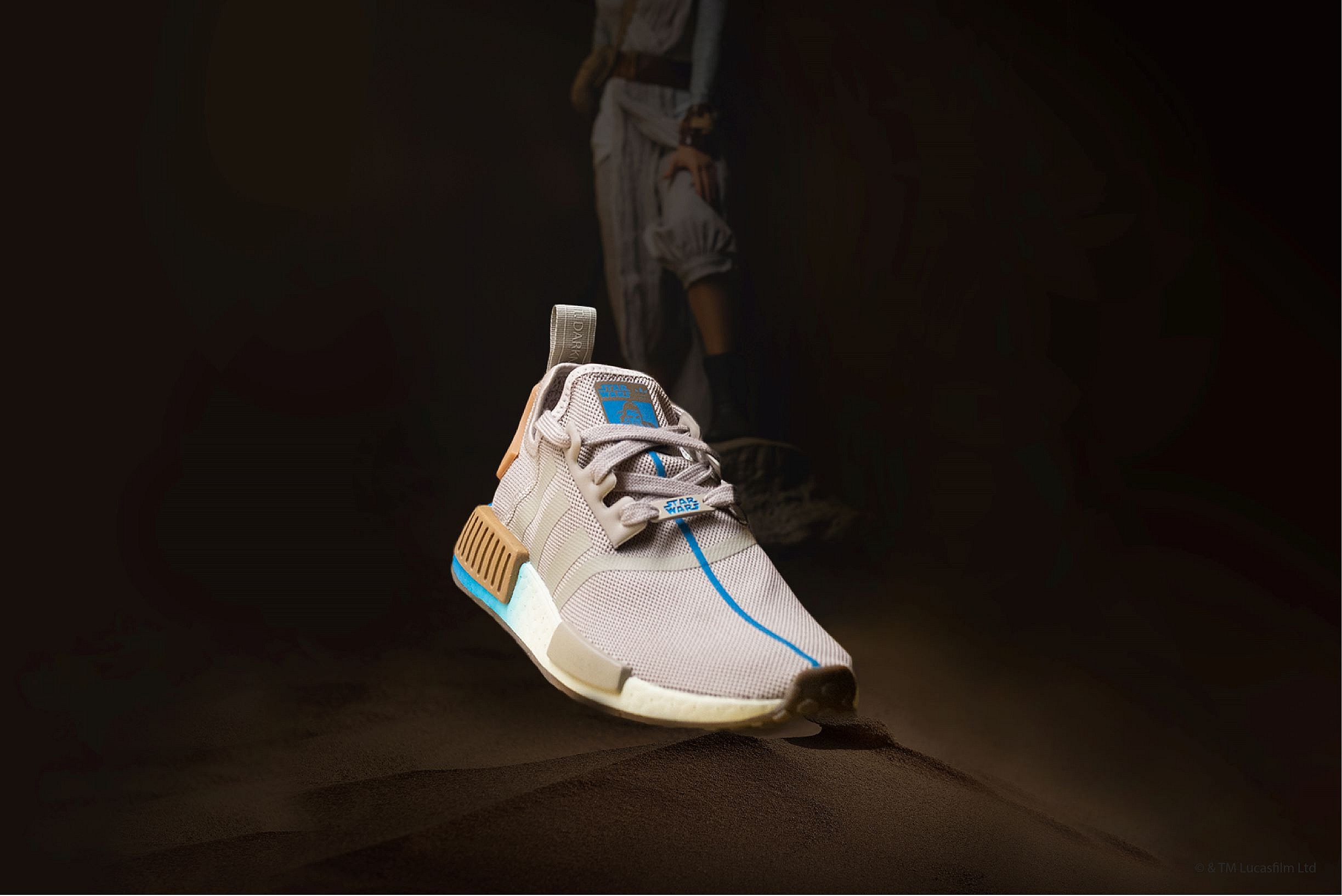 Another pair of women’s-sized NMDs celebrate Princess Leia and Rey. The former has a white, black, tan and maroon upper with the word “Hope” stamped across the heel, while the latter dons a light brown-and-blue facade and a heel tab slogan that reads “Light. Darkness. A Balance.”