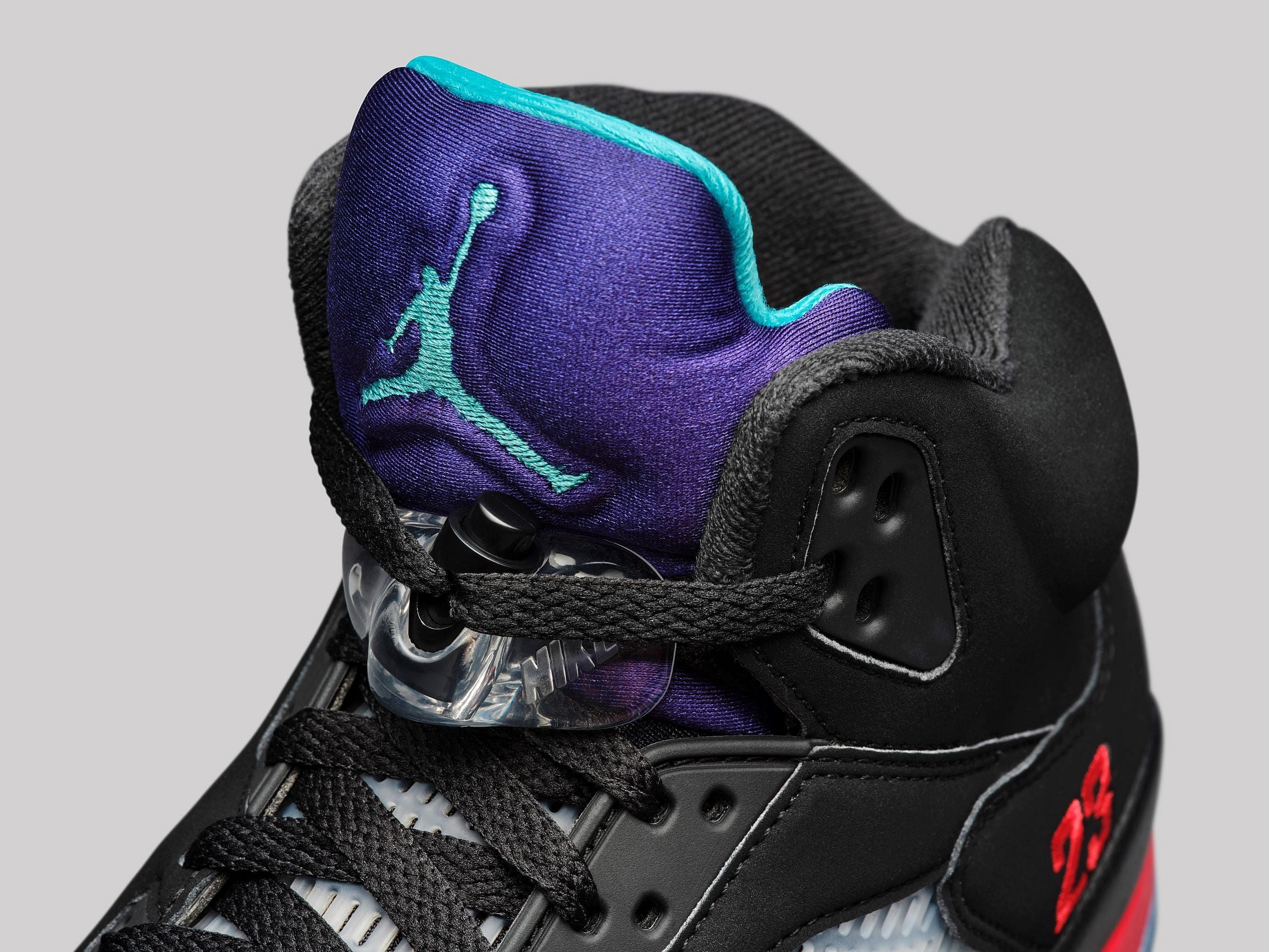 The Air Jordan V Retro returns in its original Fire Red colorway in its latest iteration, which includes an iced-out blue rubber outsole and classic details like a silver tongue, red Jumpman and Nike Air branding.
