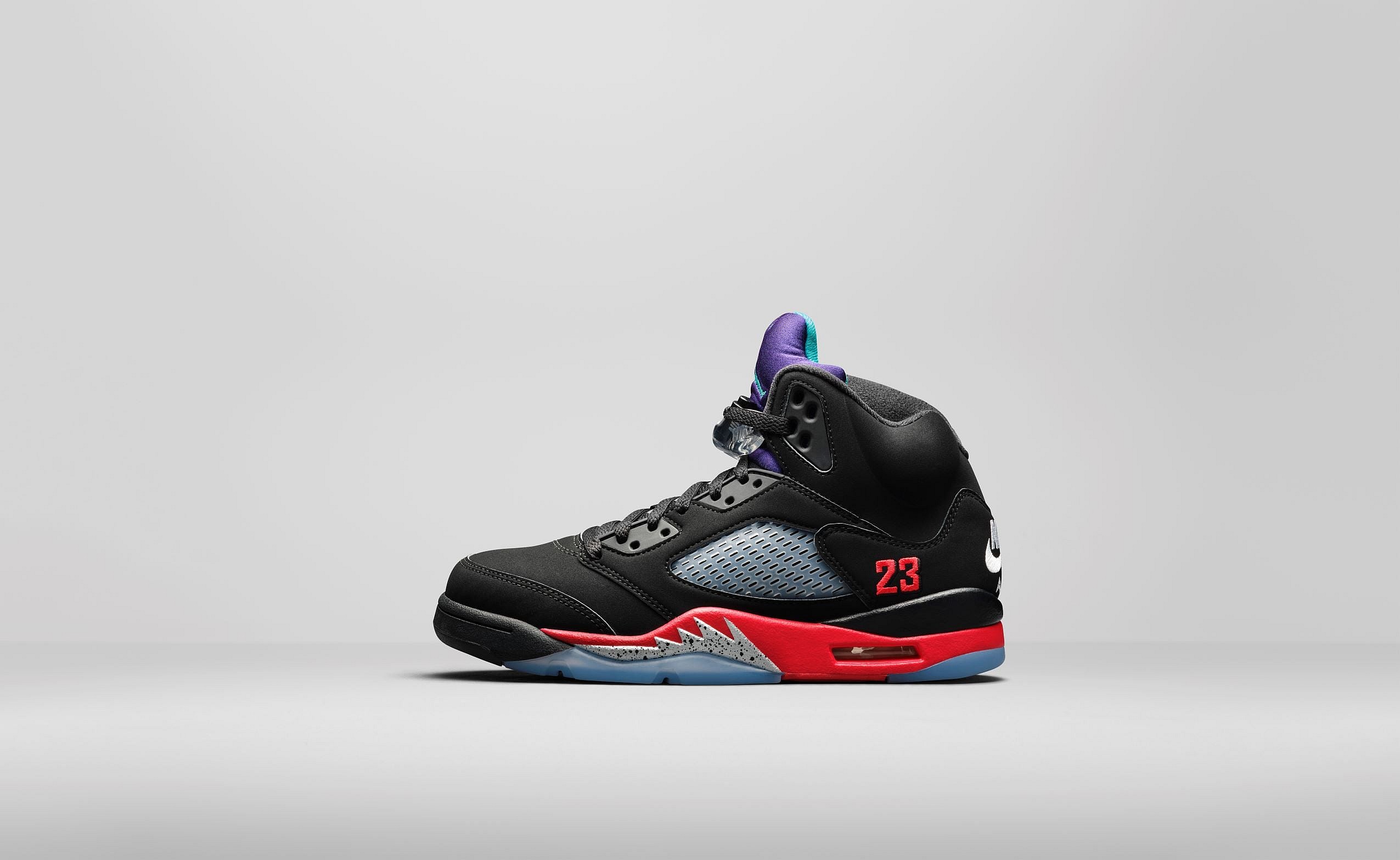 A second take on the legendary silhouette combines three most beloved colorways: Fire Red, Metallic and Grape.