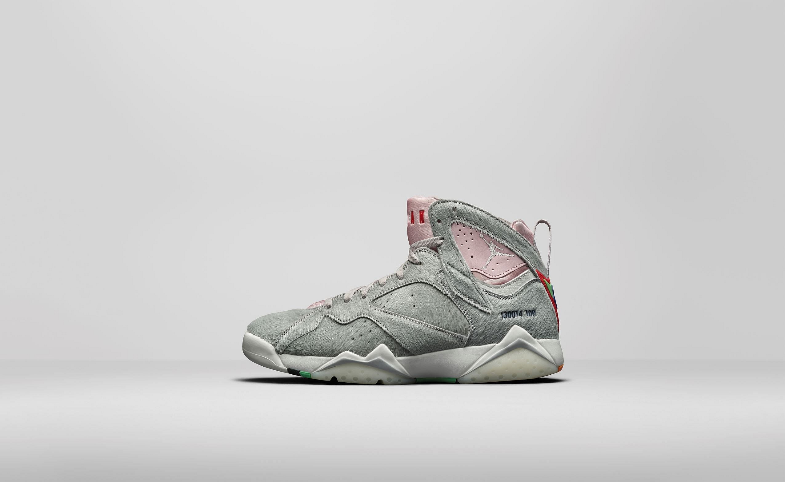 This fresh take on the Air Jordan VII gets a mix of vibrant colors on a light gray upper and the numbers “130014-100” stitched on the upper, in reference the style code of the original 1991 colorway.