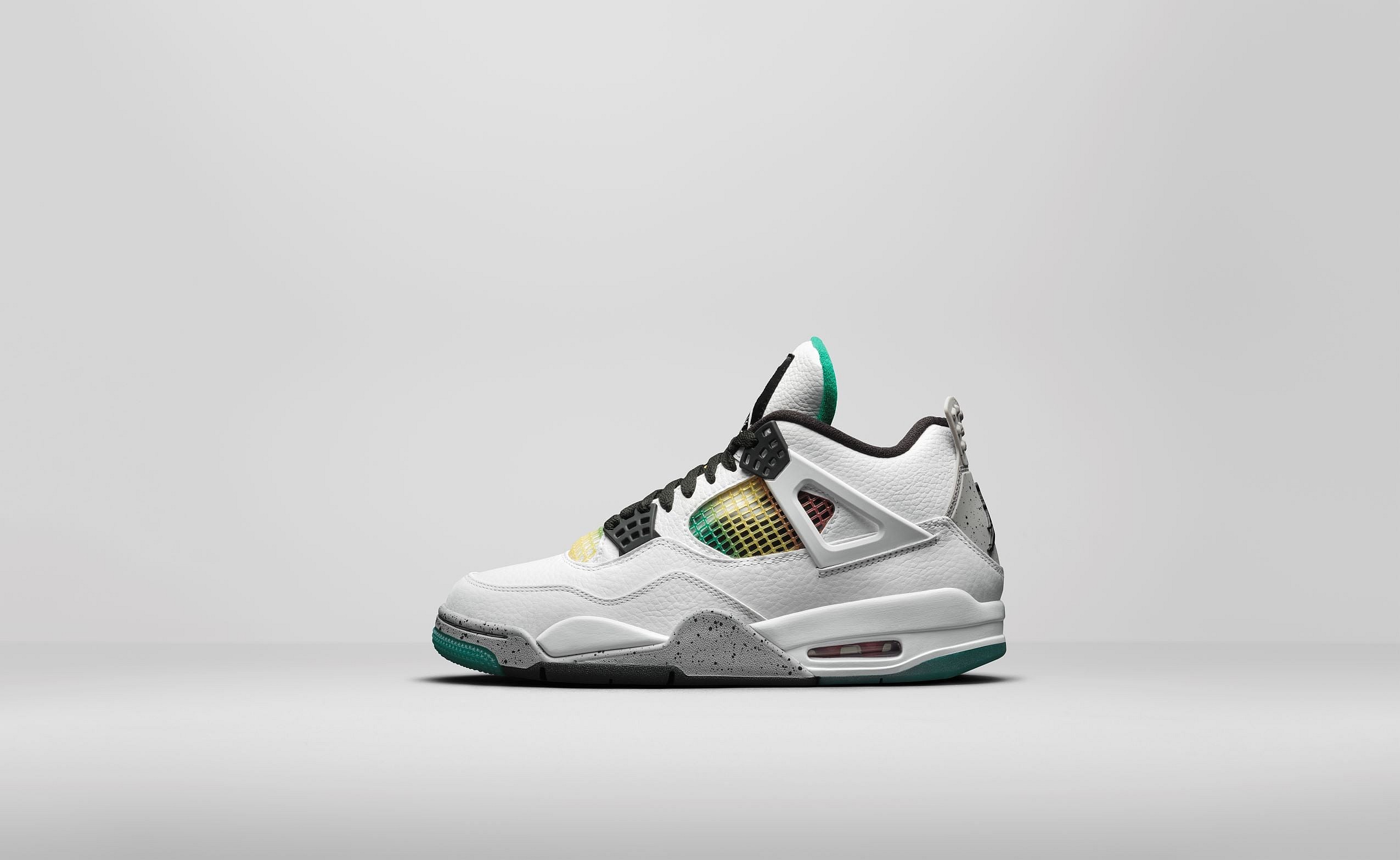 A white tumbled leather upper with an OG cement-like midfoot, toe and heel tab are paired with pops of red, green and yellow in the netting.