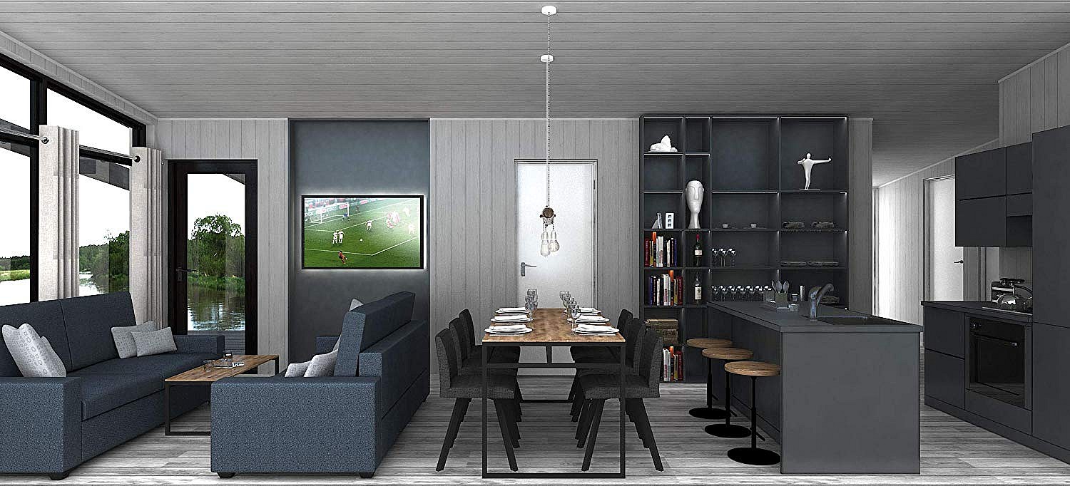 The Cliff design comes with a living room, open, furnished kitchen and dining areas, 3 bedrooms and one bathroom equipped with a sauna or tub. There’s also storage space inside and out.