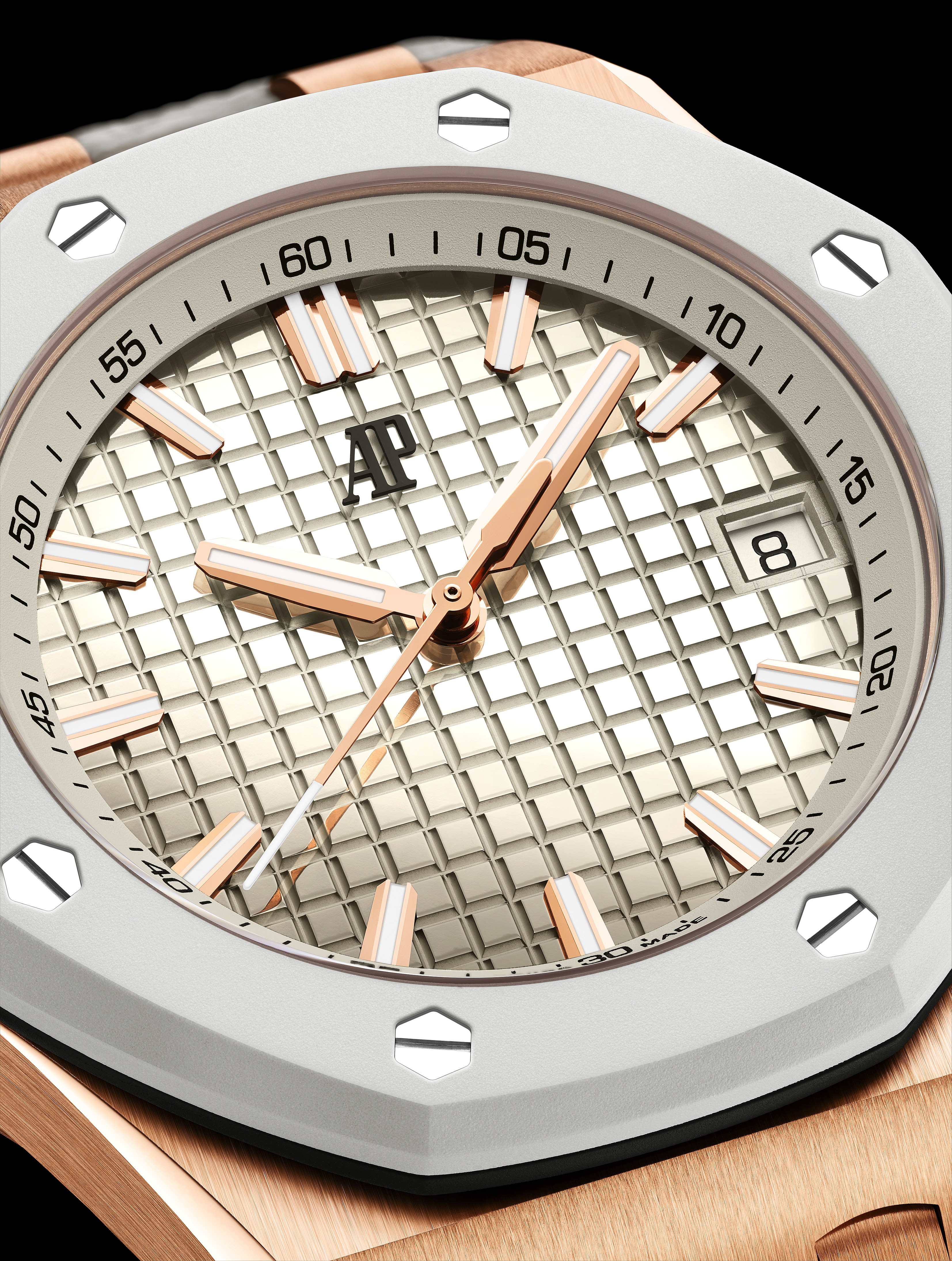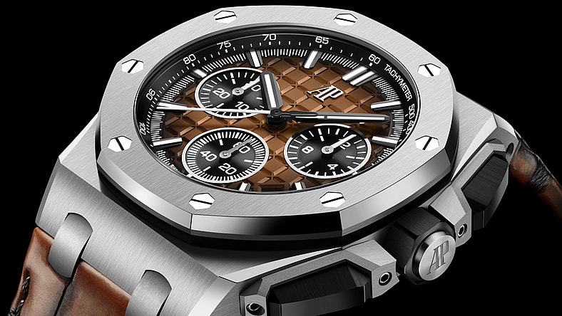 Perhaps the most visually appealing new option is an Offshore edition featuring an 18-carat pink gold case. The more classic Royal Oak Offshore entry in the trio is the aforementioned textured brown leather strap offering, but each model (particularly the pink gold case offering) boasts distinctive looks and luxurious finishes.