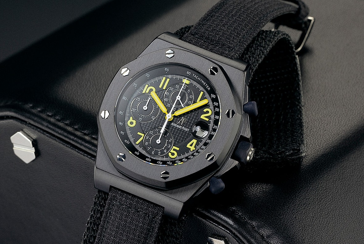 Schwarzenegger’s Royal Oak Offshore featured a Kevlar strap and a steel case with a PVD treatment, while the newest edition boasts a lightweight blend of ceramic and titanium.