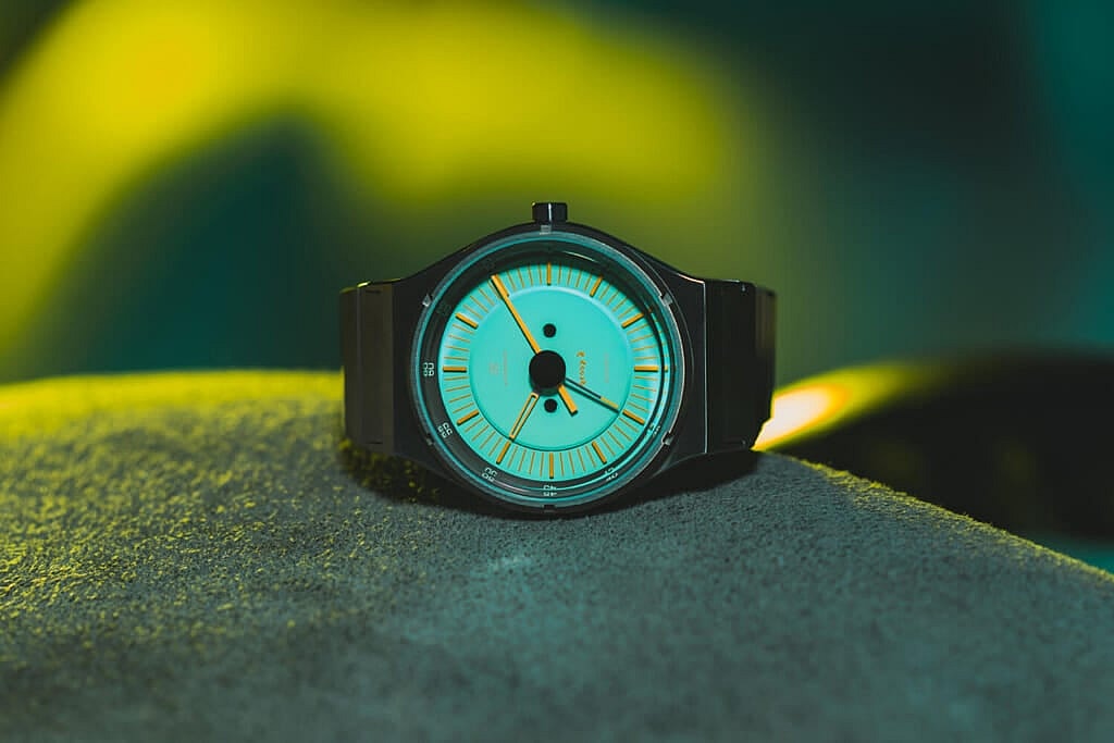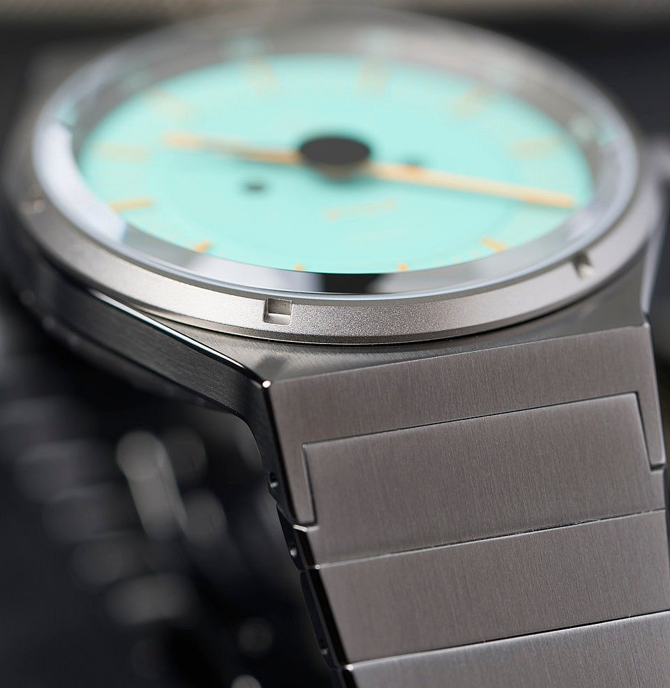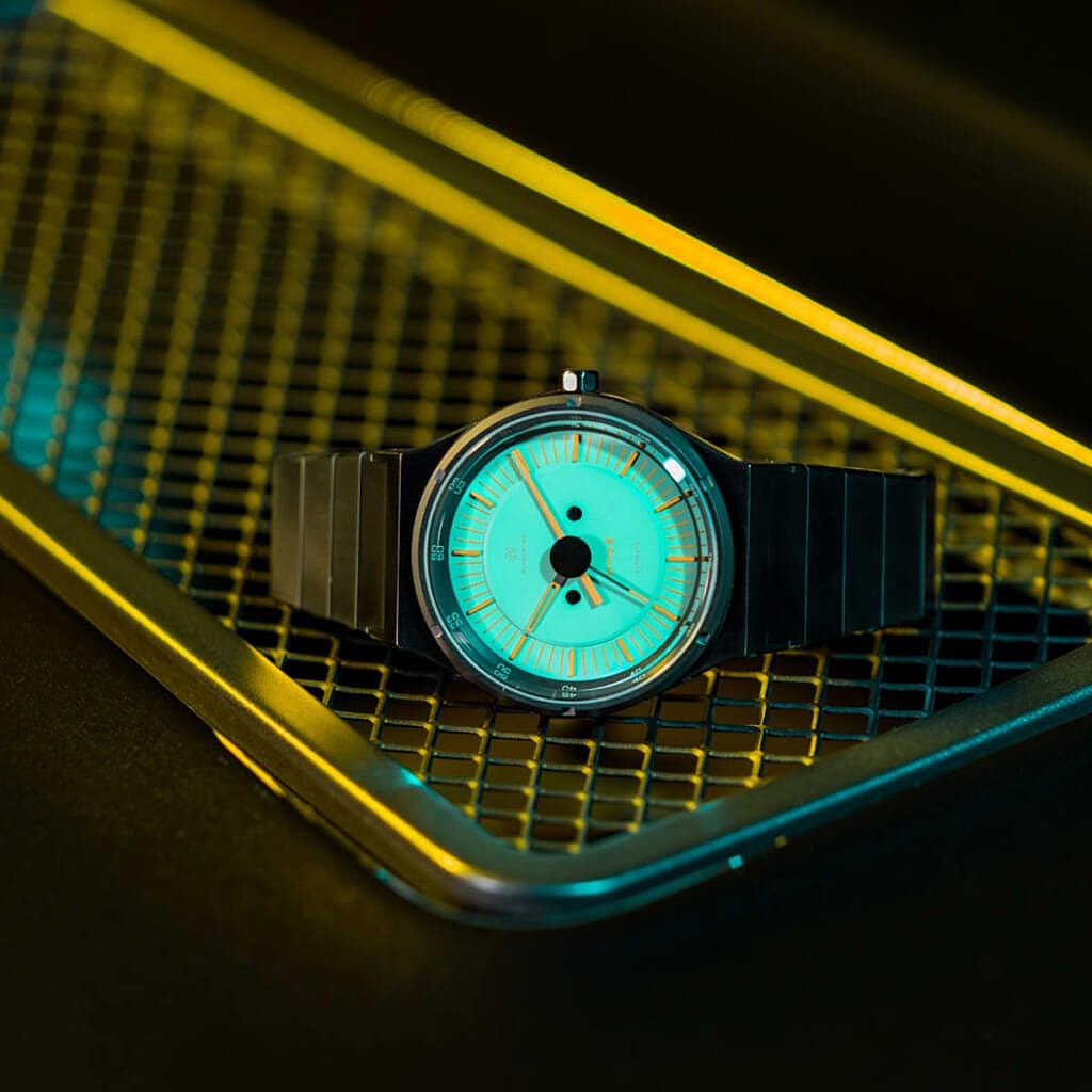 The details “under the hood,” so to speak, are impressive, but the vibrant aqua blue color is all ’80s in its own right, offset by strong, crisp dial markings in a striking orange.