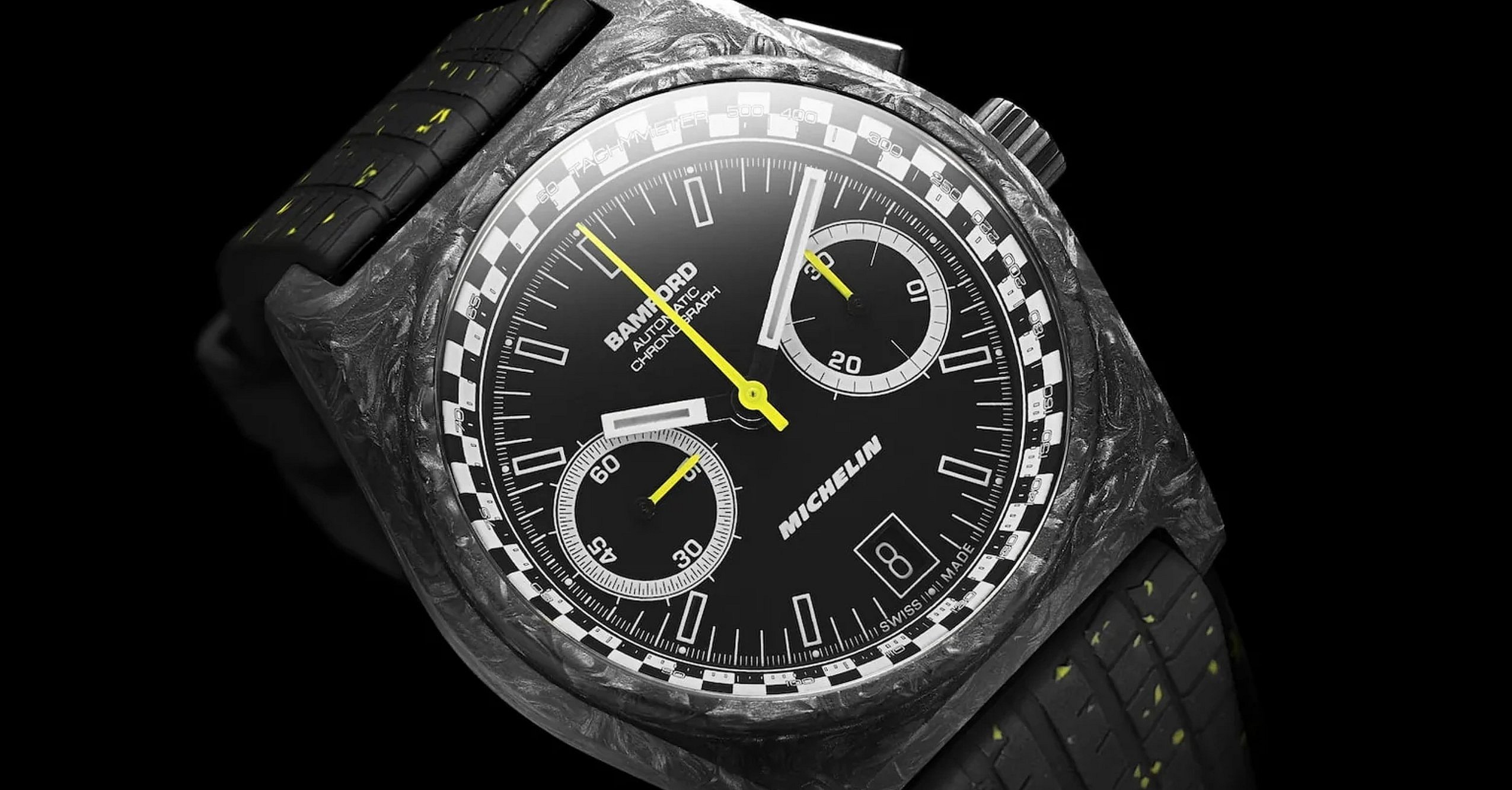 The 41.5mm watch itself, however, features a motorsport-inspired design, with a case crafted from carbon fiber, a checkered flag pattern adorning the bezel, and a black-coated steel caseback with an engraving of the Michelin Man.