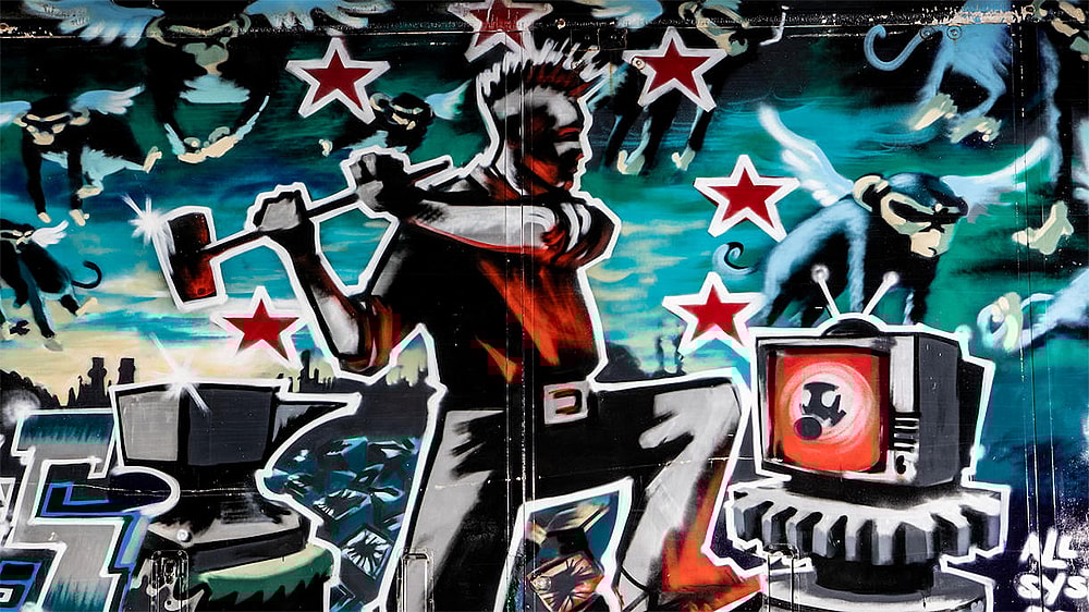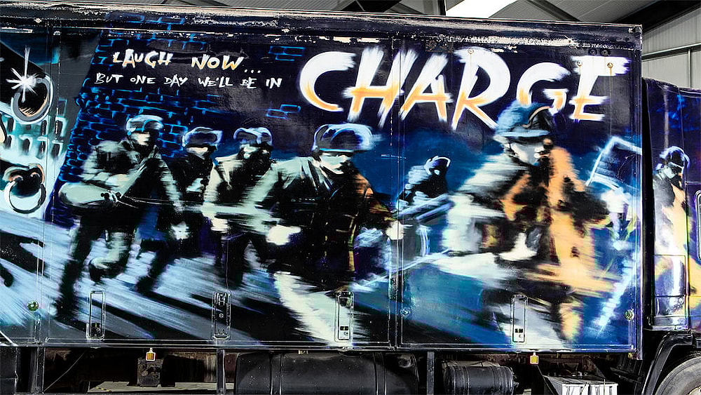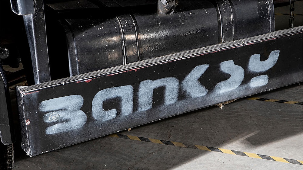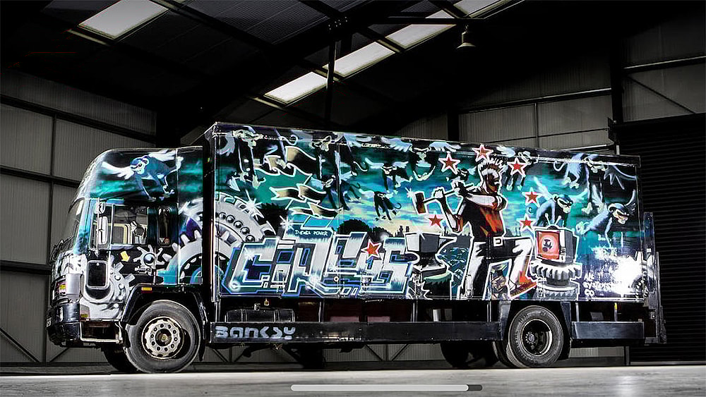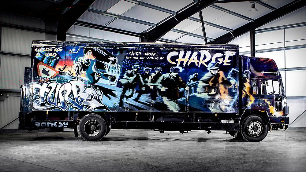 While attending a New Year’s Eve party in Spain in 1999, famed street artist Banksy began painting a 17-ton 1988 Volvo FL6 truck that he completed in early 2000, which remains one of his largest pieces to date.