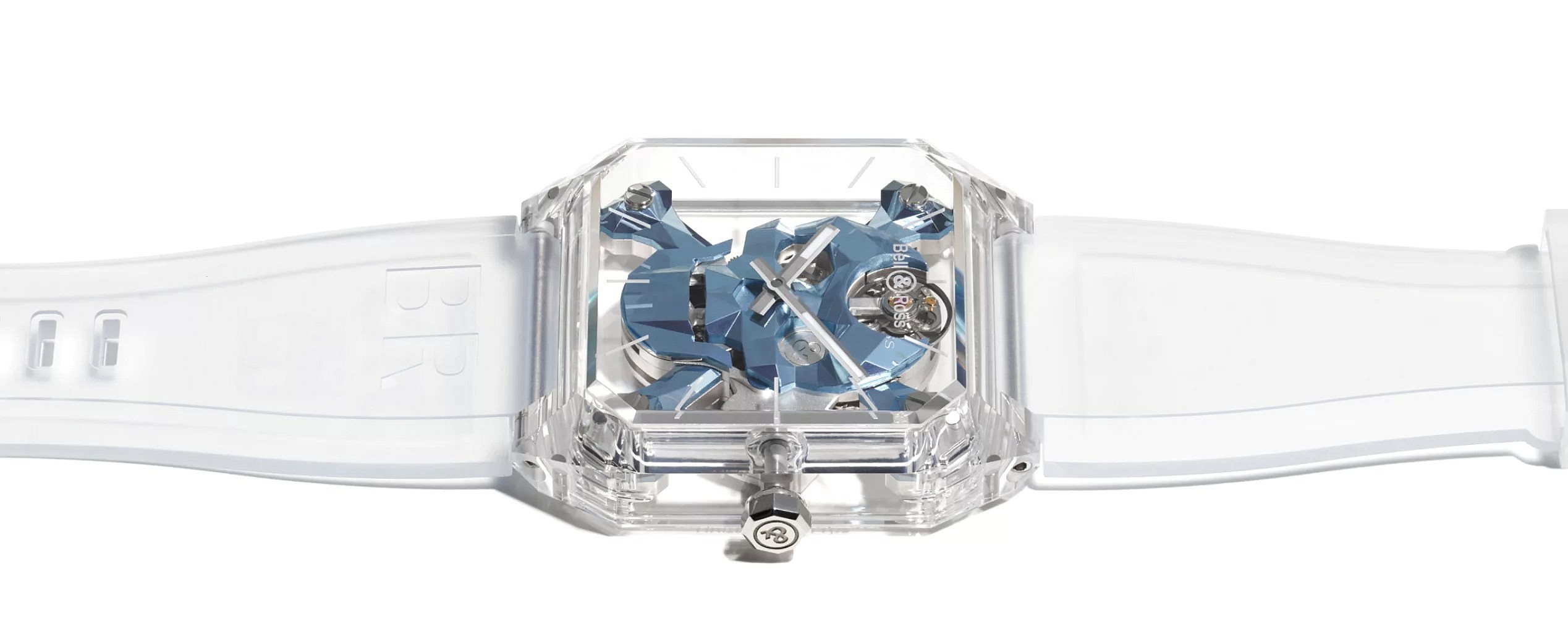 “The architecture of the watch makes the skull appear to float weightlessly inside the case,” Bell & Ross notes, pointing to its hits of ice blue as a “a bold and unusual color in fine watchmaking.”