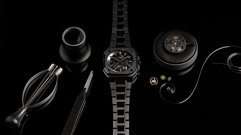 The BR-05 Skeleton Phantom Ceramic features a unique, fully skeletonized movement visible through a transparent dial, encased in a ceramic case and bracelet with refined finishes. The entire watch is presented in a “full black” finish, which the company describes as “dressed in light,” emphasizing the interplay of shadows and reflections.