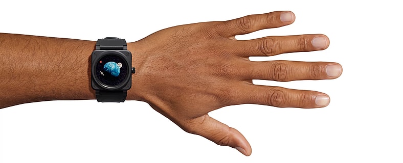 Perhaps in an effort to keep focus on the watch’s unique face, the BR-03 Astro’s other components are understated: the sapphire has been hollowed out to accentuate the Earth; the caseback features simple Bell & Ross branding alongside ceramic type, water resistance (100 meters/325 feet) and country of origin; and the strap is available in black rubber or black synthetic with a matte-black buckle.