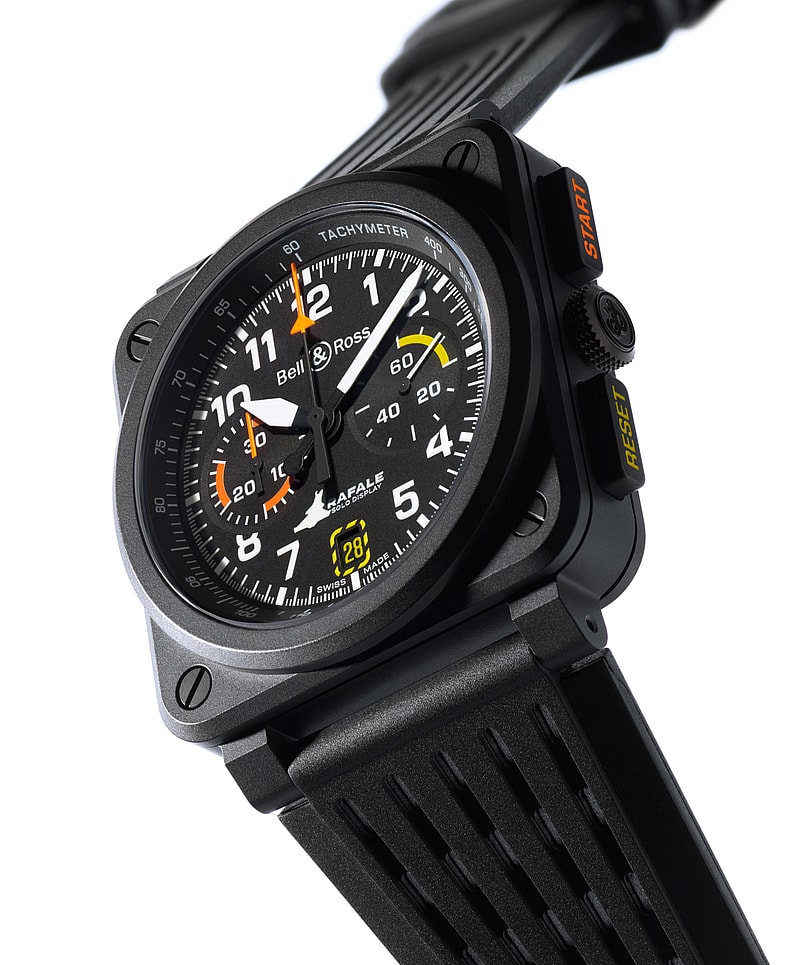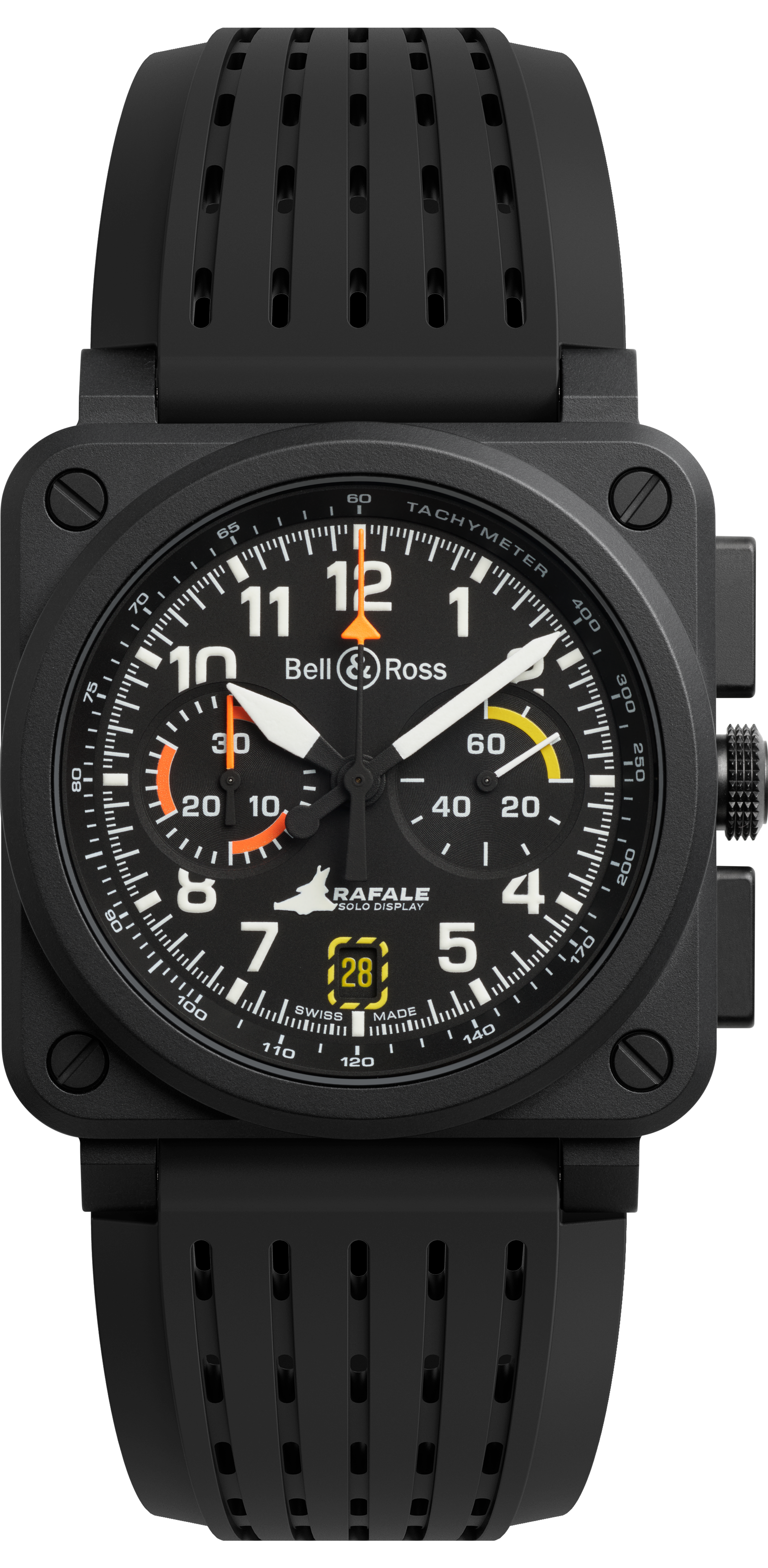 The new BR-03 Chrono is a fitting tribute to this high-octane partnership. The watch is presented in a 42mm micro-blasted black ceramic case, a signature of the brand that echoes the anti-reflective finish of aircraft instruments. The matte black dial provides a high-contrast canvas for the white numerals and indices, ensuring optimal legibility. A subtle, yet powerful, tribute to the Rafale team is found in the bursts of orange and yellow on the chronograph sub-dials and hands, mirroring the colors of the Rafale Solo Display’s logo. The watch’s chronograph pushers are also uniquely engraved with “START” and “RESET” and filled with colored lacquer.