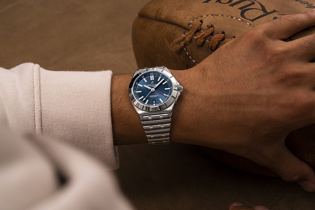That elegant yet highly useful GMT functionality offers up the ability to track the time in two locales at once thanks to a dedicated fourth hand, blended expertly with what Breitling calls subtle dial colors (five in total) and “easygoing aesthetics.”