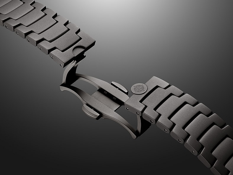 The monochromatic stunner’s 42mm case is crafted from treated Grade 2 titanium, giving it an ultra-matte finish that absorbs light like a black hole.