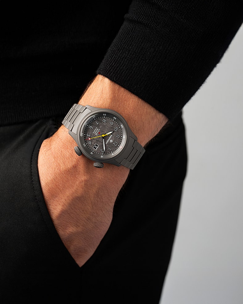 The stealthy monochromatic model also features an exhibition caseback, allowing you to admire the movement’s gunmetal grey finishing and Geneva stripes. The watch comes on a sandblasted titanium bracelet with a quick-release function, making it easy to swap in for a strap while maintaining the watch’s lightweight, high-performance feel. With the MB Altitude Stealth Grey, Bremont proves once again that a watch designed for the skies can also be a standout on the ground.