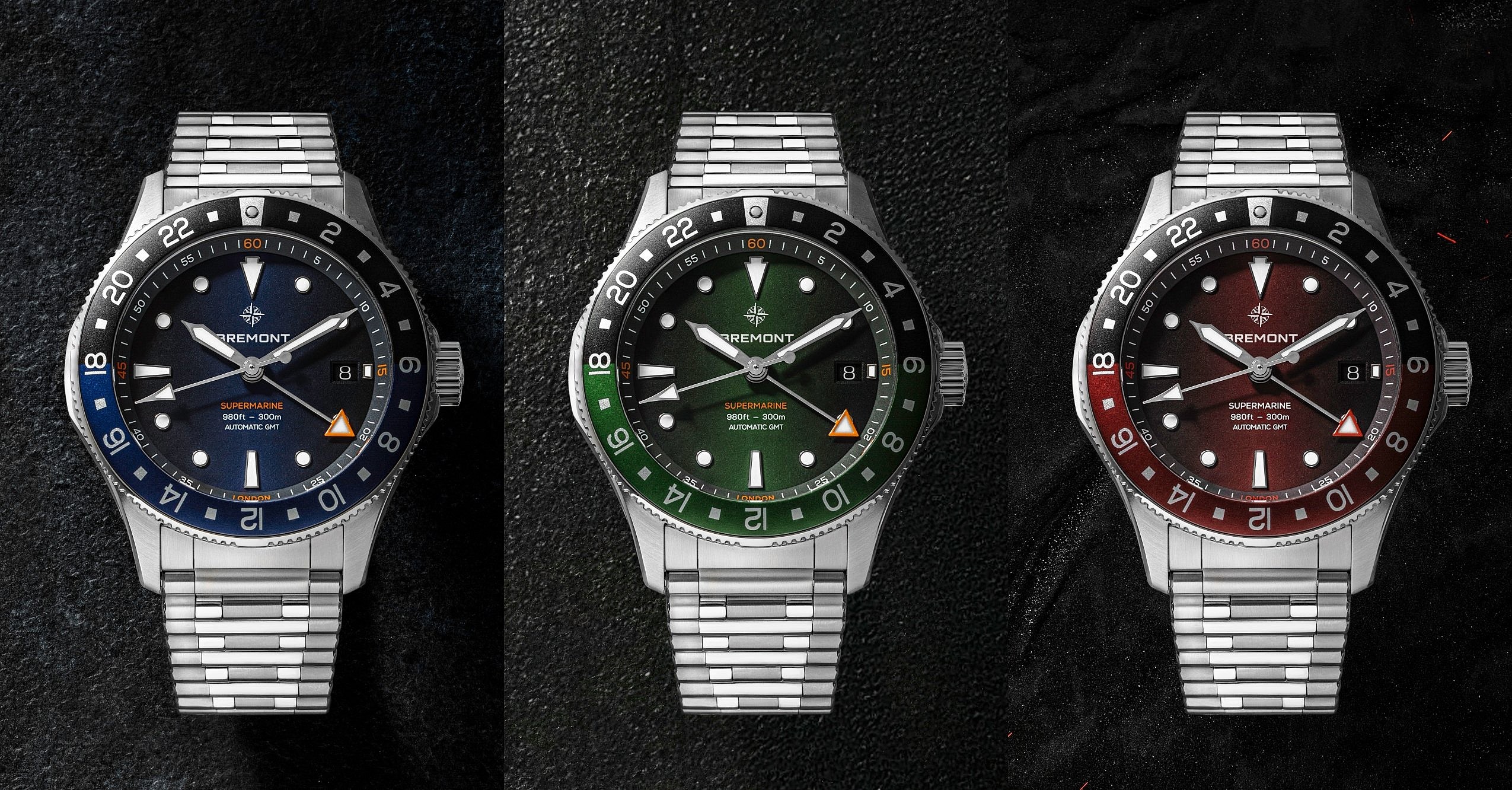 Each timepiece is finished with a distinctive linear gradient dial, one further accented by contrasting orange GMT hands and markers on the “Glacier” and “Tundra” editions of the rugged-meets-refined dive watch.