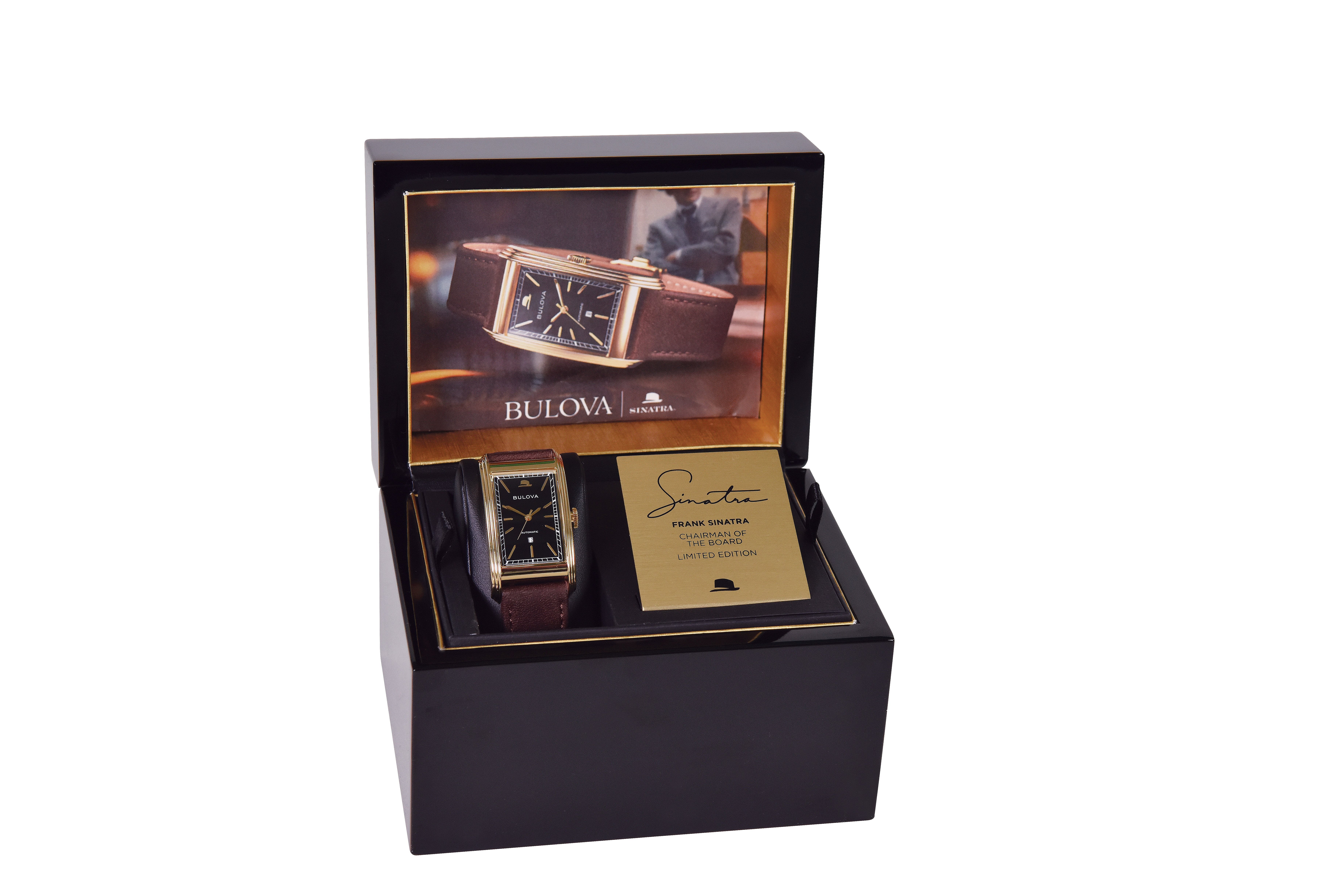 The elegant “Chairman of the Board” timepiece blends Art Deco design with the iconic flair and style of the man himself. The 18-karat gold case, as Bulova says, “showcases detailed stepped flanks and a graceful, sweeping arc,” not unlike the career of Sinatra himself.