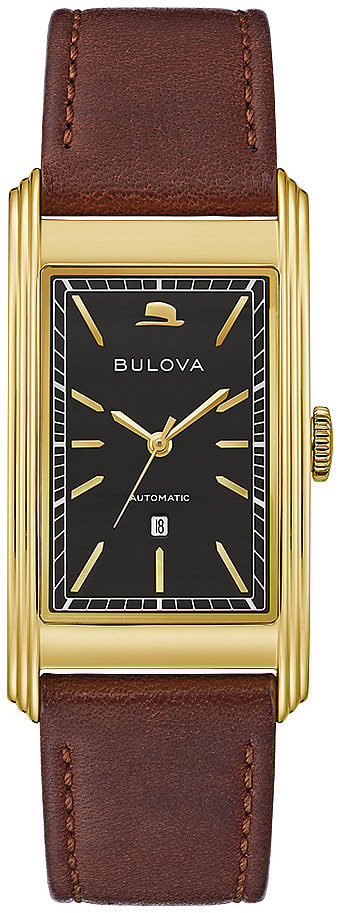 The gold-plated stainless steel case takes design cues from Bulova’s iconic 1936 “President” model, and as the timepiece maestro says, “the watch radiates vintage charm and modern elegance.” Double-curved sapphire crystal contrasts stylishly with a deep black dial, further accented by gold-tone markers and hands.