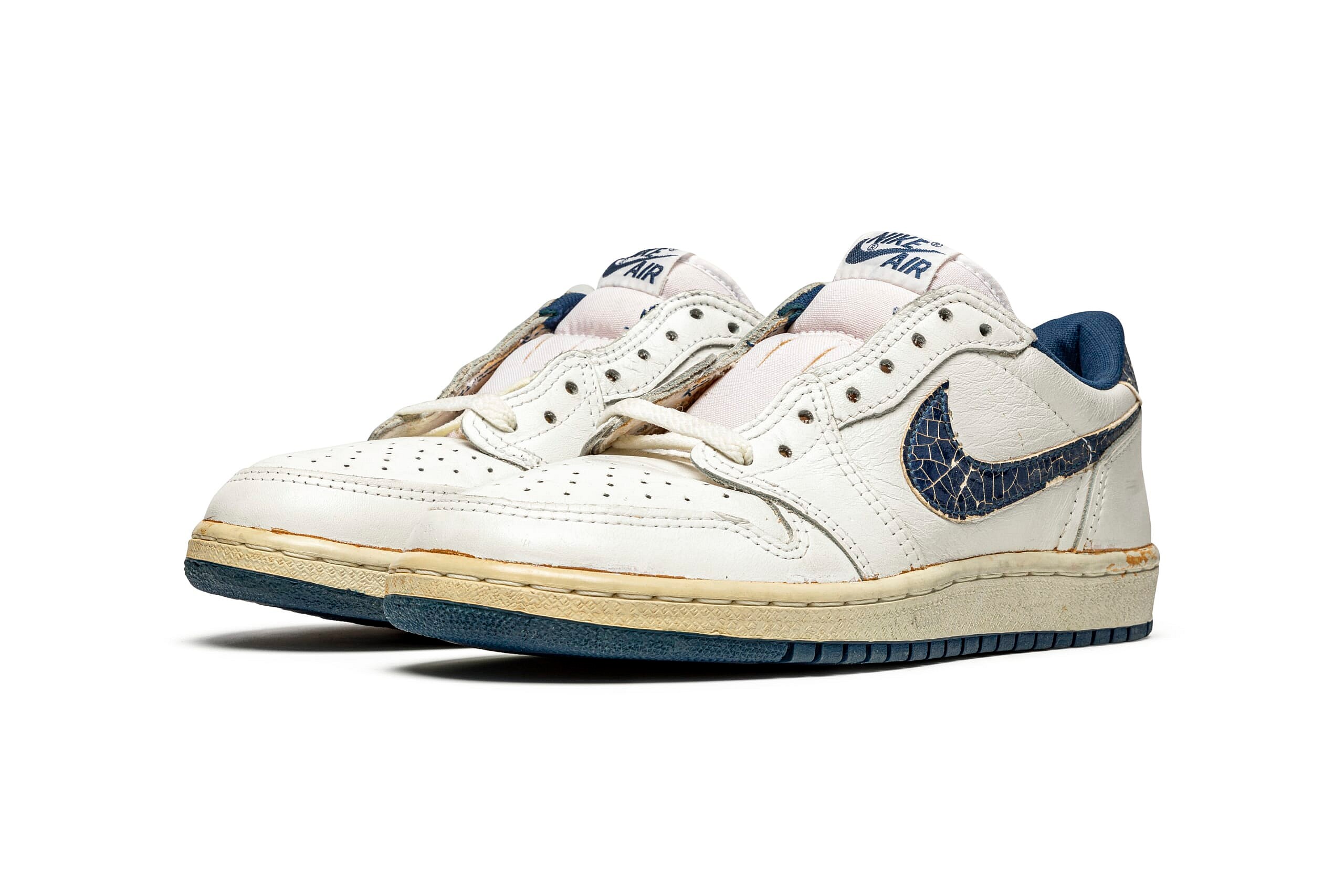 The AJ 1 may be best remembered as a high-top, but the Air Jordan 1 Low “Metallic Blue” is one of only three original colorways of the much more limited low-top. The colorway features a white leather base with metallic navy blue accents for the side Swooshes and heel tab. $12,000-15,000