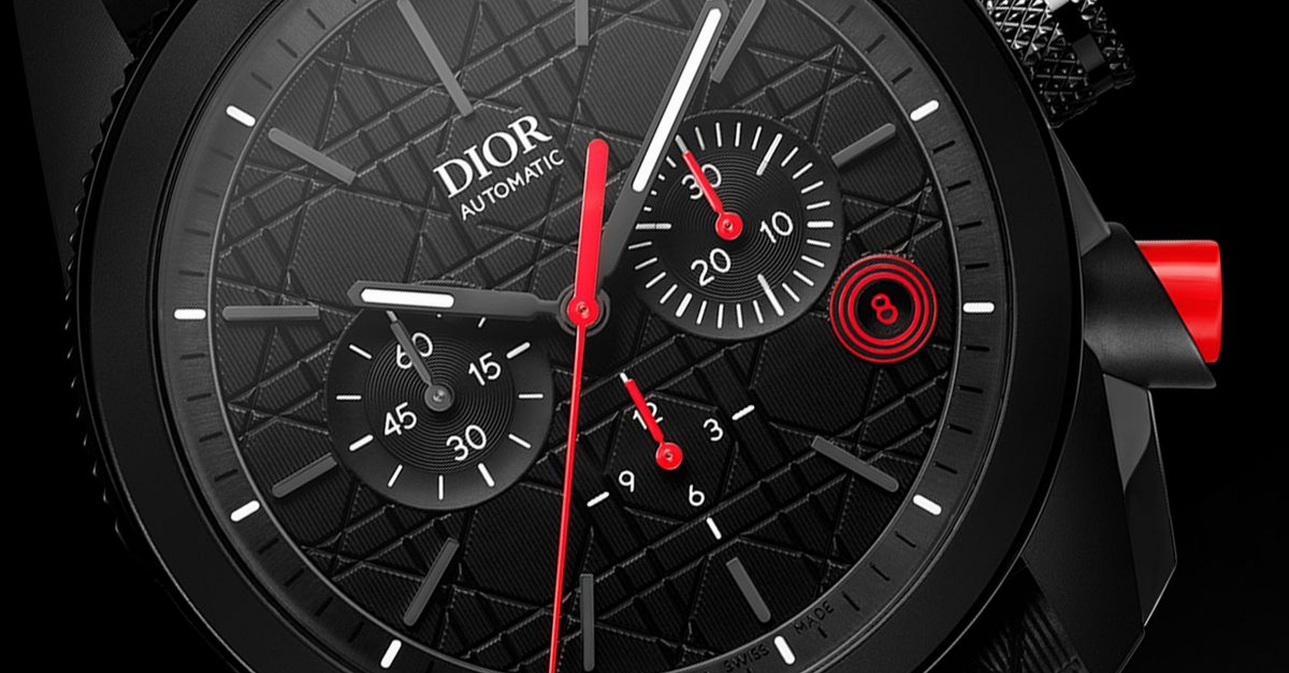 Triple-chronograph functionality pops nicely on the angular dial, which features sleek black indices, two-tone hours and minutes hands and that characteristic red seconds hand in a nod to Dior’s use of red throughout its line.