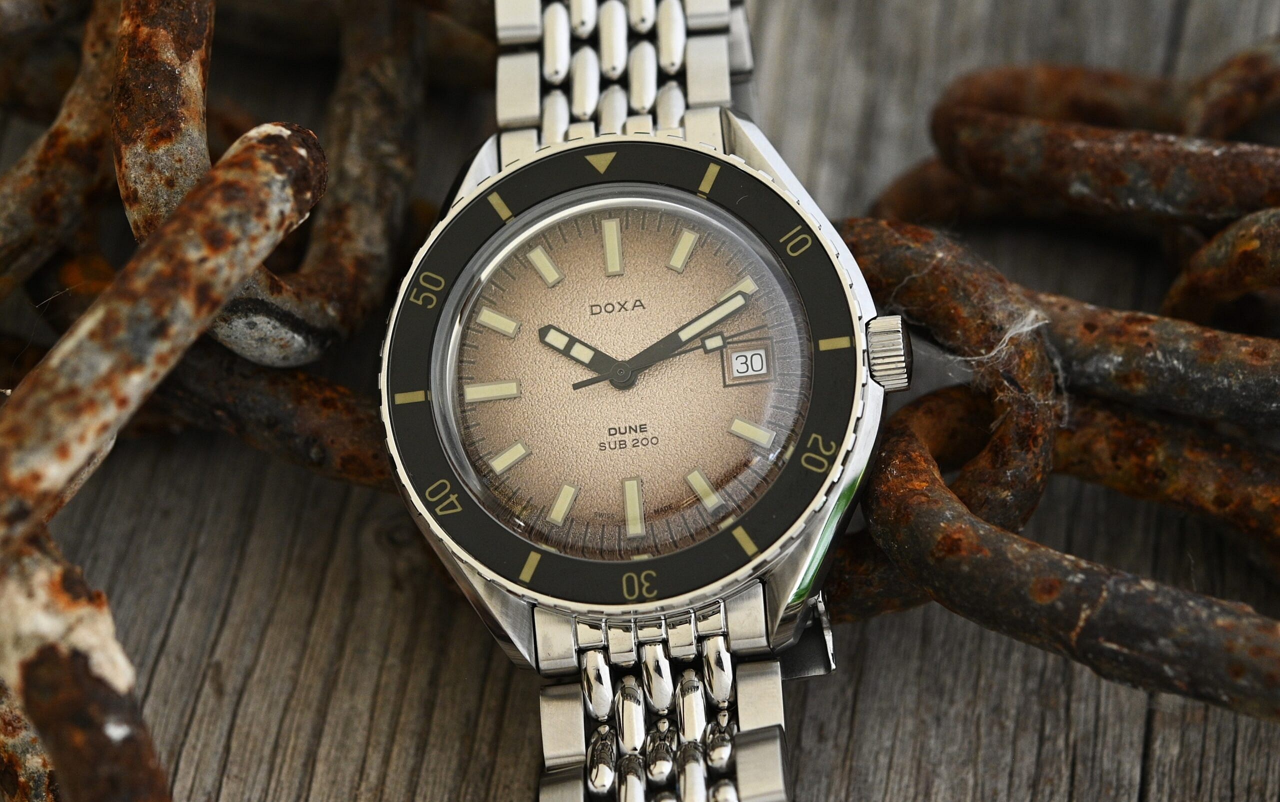 The Sub 200 Dune features a sand-grain textured dial that shifts between sun-bleached taupe and warm bronze tones, evoking the look of windswept dunes. The 42mm stainless steel case retains the classic elements of the Sub 200 line, including a unidirectional luminous sapphire bezel, a domed sapphire crystal, and 200-meter water resistance.