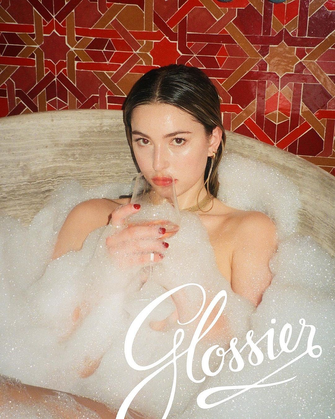 According to the New York Post, the ads were self-photographed. In the first, the Apple heiress applies red Glossier Lip Gloss while wearing under-eye face masks during a bubble bath. The second shows Jobs pursing her newly enhanced lips around a glass of wine as she gazes at the camera.