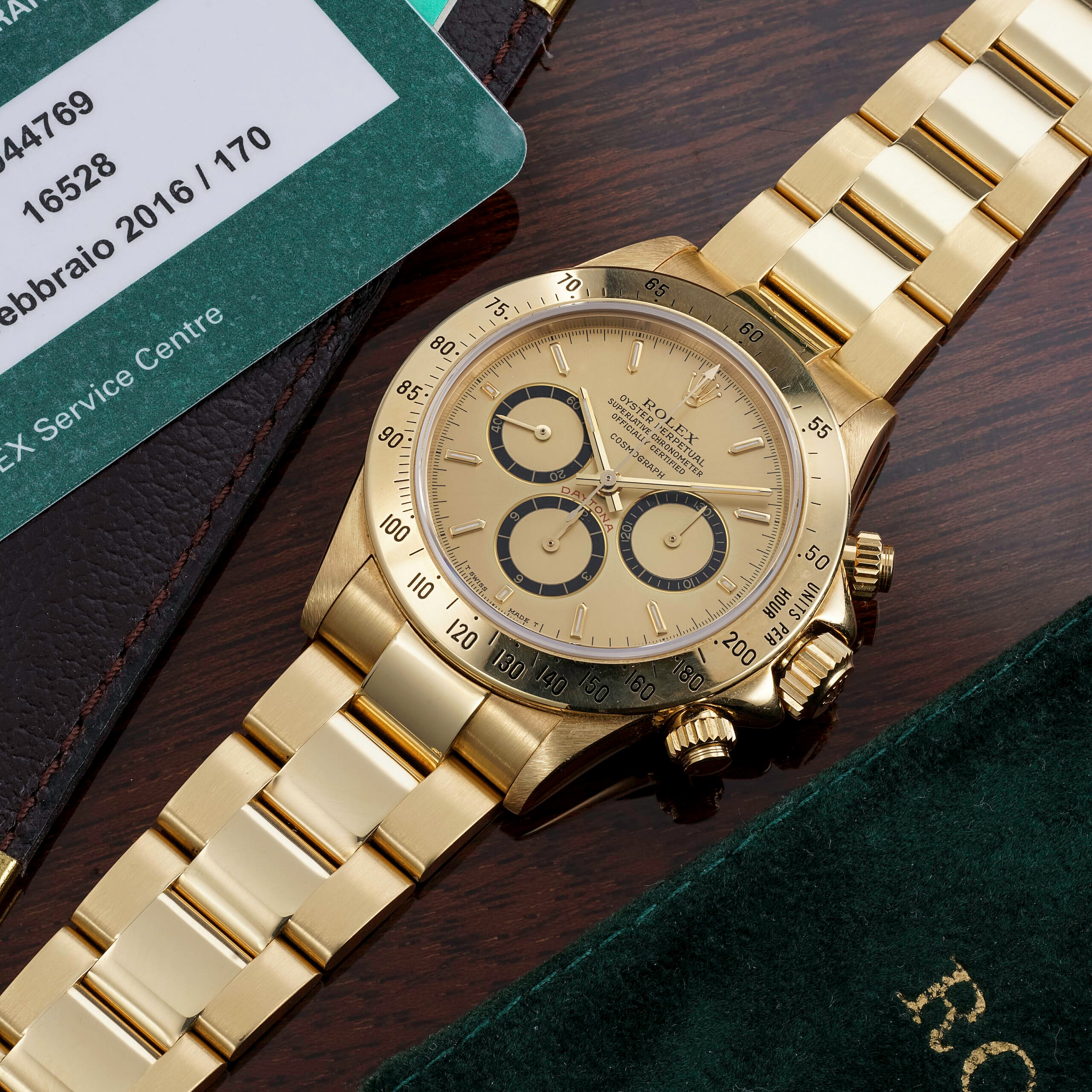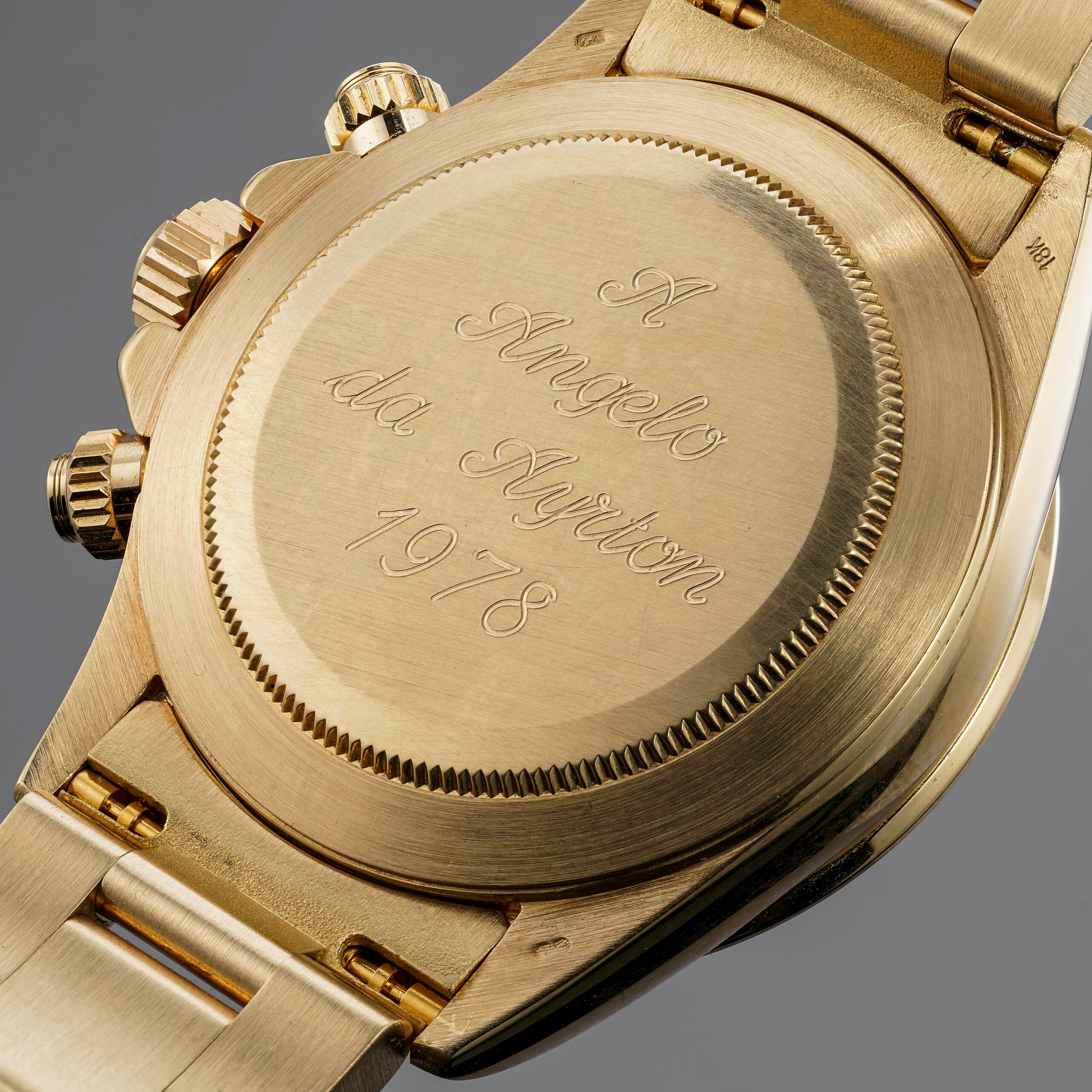 The watch, a “floating dial” ref. 16528, the earliest iteration of Rolex’s first automatic gold Daytona, is inscribed “A Angelo da Ayrton 1978” (to Angelo from Ayrton). As Phillips notes, “This timepiece spans more than horology – it is part of a unique history between one of the most iconic watches in the world, the sport that the Daytona is synonymous for and one of its greatest ever drivers.”