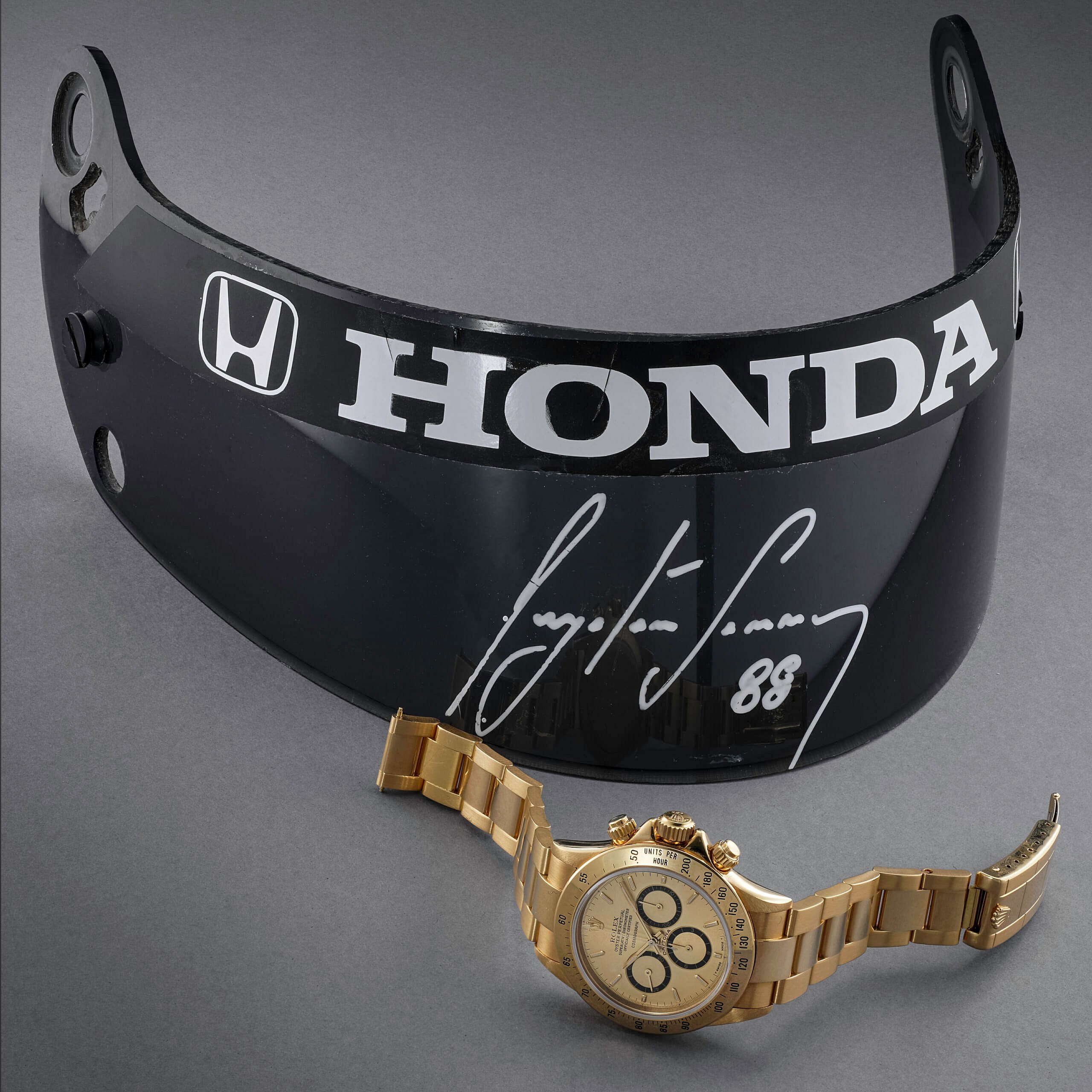 The watch comes with an F1 helmet face shield signed by Senna and dated 1988, adding to its value. Widely considered one of the greatest Formula One drivers of all time, Senna was the subject of an award-winning documentary in 2010 and remains a hero of motorsports enthusiasts everywhere.