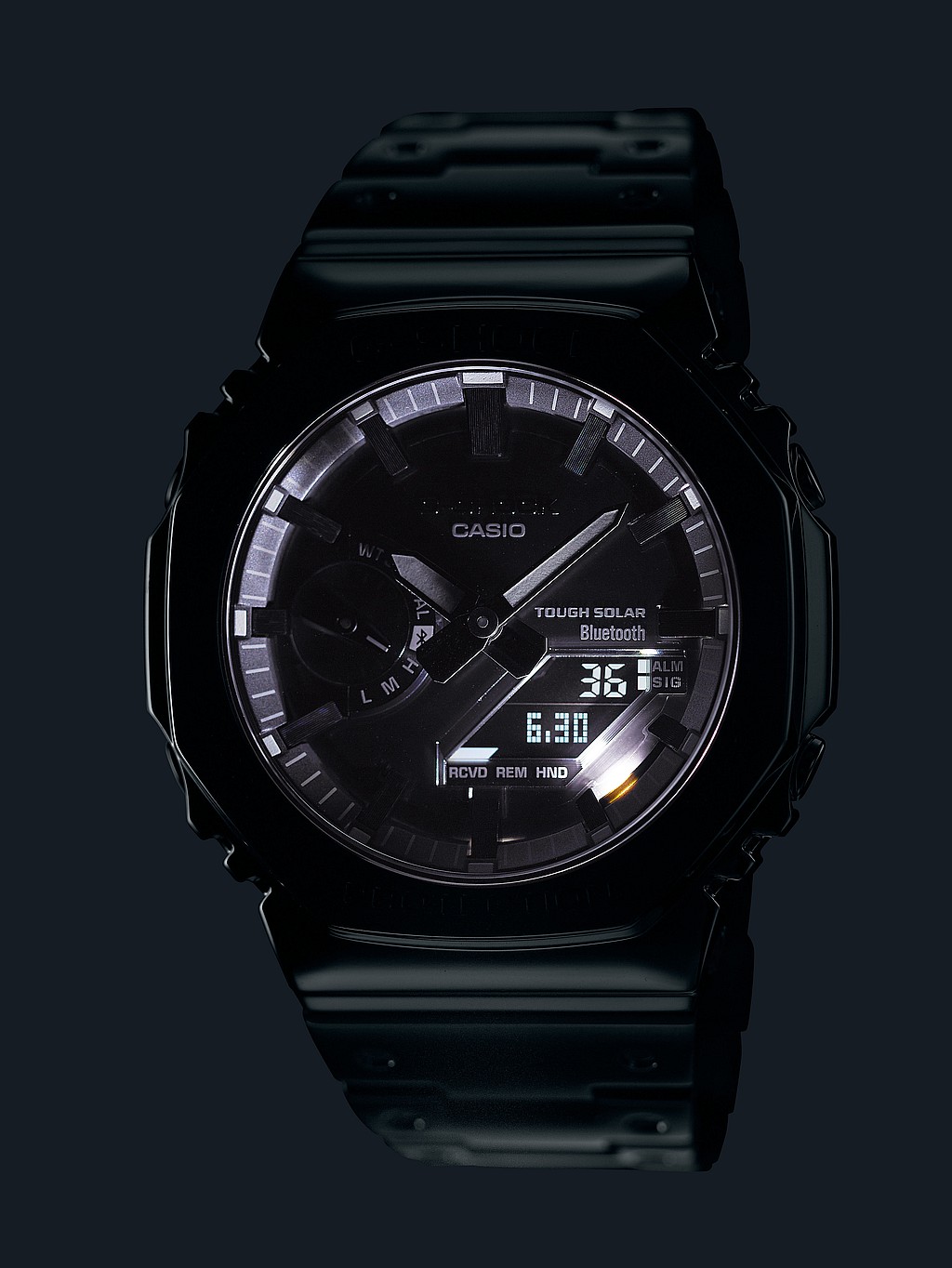 With a 12.8mm thickness, the GMB2100s are the slimmest of all full-metal G-Shocks. But designers ensured that they don’t appear insubstantial by accentuating the indexes and inner-dials with vapor deposition coating, which both protects those surfaces and emboldens detail. There’s also a layer of fine resin between the bezel and inner-case to aid in shock absorption.