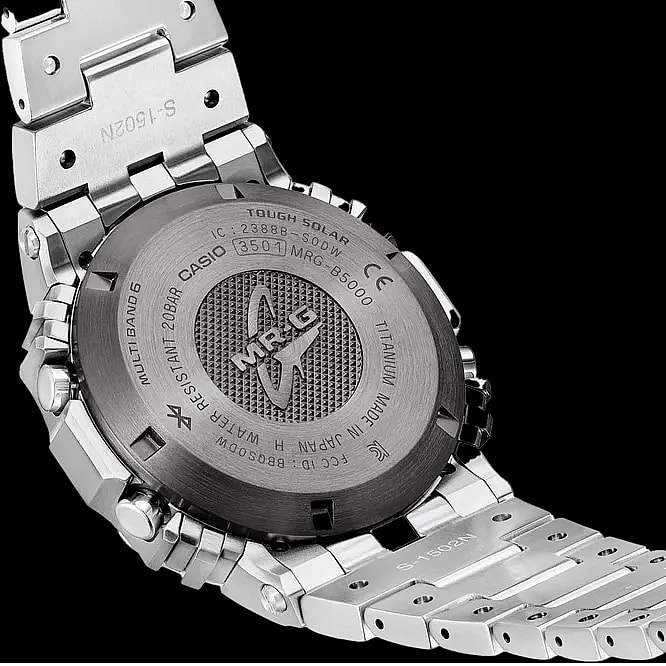 The sharp MRGB5000D-1 has a dressier look and feel, with a bezel made of high-hardness Ti64 titanium alloy and a band made of  DAT55G titanium alloy (it’s three times harder than the titanium made on your go-to dive watch right now).