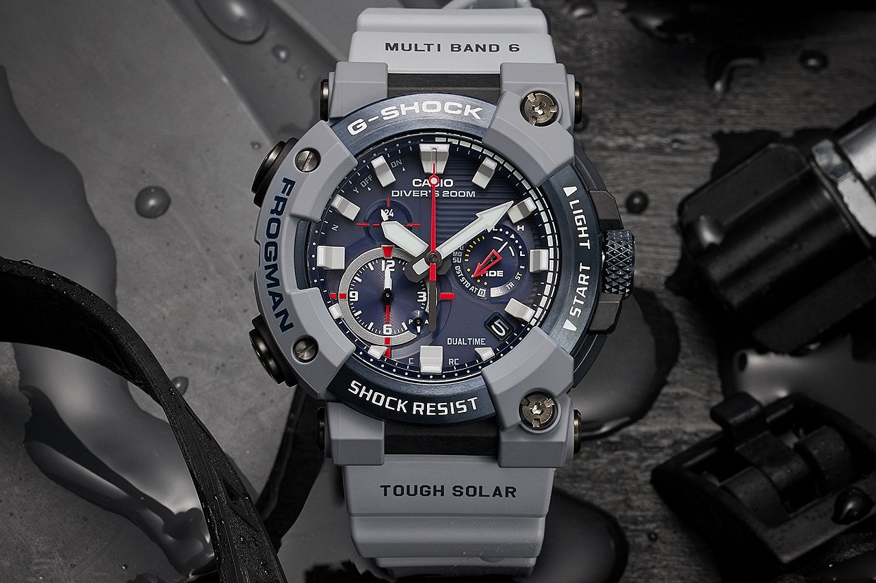 The Royal Navy x G-SHOCK Frogman is water-resistant to 200 meters and according to Casio, powered by a “trio of dual-coil motors.”