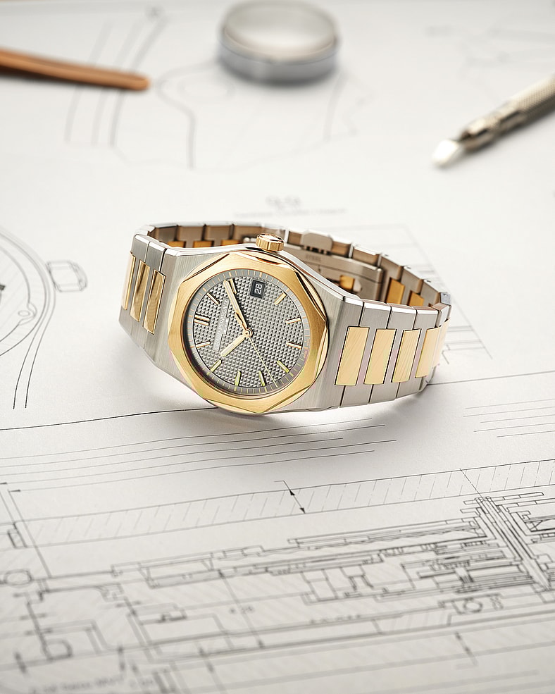 3N-plated gold indices and hands dot the grey sunray dial, which is given a chic “Clous de Paris” pattern, tastefully accenting the two-tone steel bracelet. The nicely sized timepiece “pays vibrant tribute to the past while projecting Girard-Perregaux into the future,” the company said of the exclusive launch. The first edition of the Laureato made waves as a chronometer-certified watch produced entirely in-house, with an integrated bracelet that helped cement its sporty, versatile appeal (along with Girard-Perregaux’s signature cushioned octagonal case).