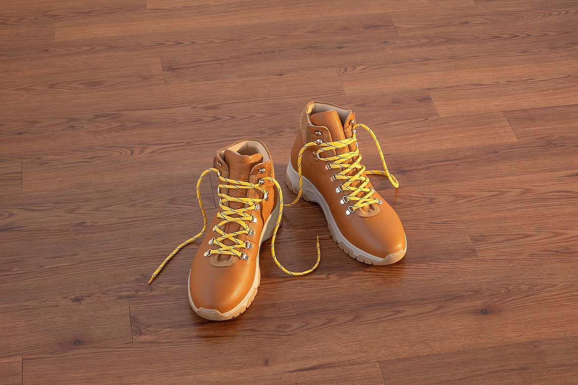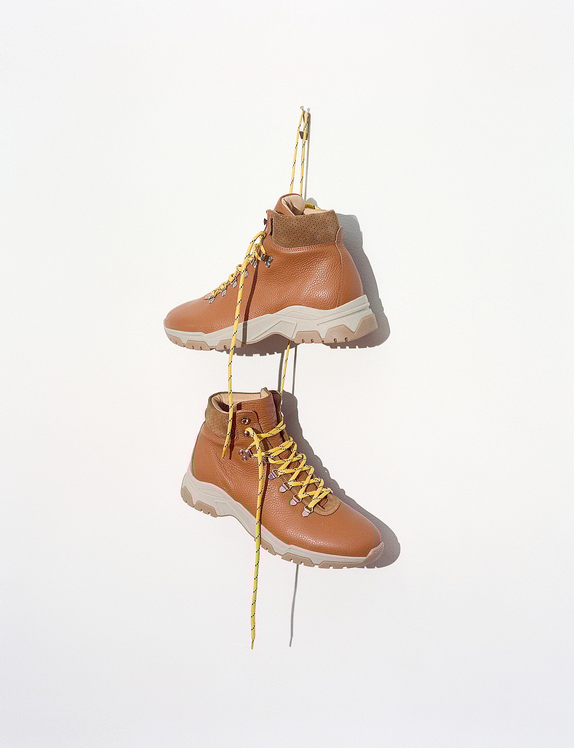 The hiking boot inspiration extends through the upper, from the vibrant contrasting yellow laces (found on the Cuoio pair) to the boot-style speed hook lacing for a snug fit and easy access.