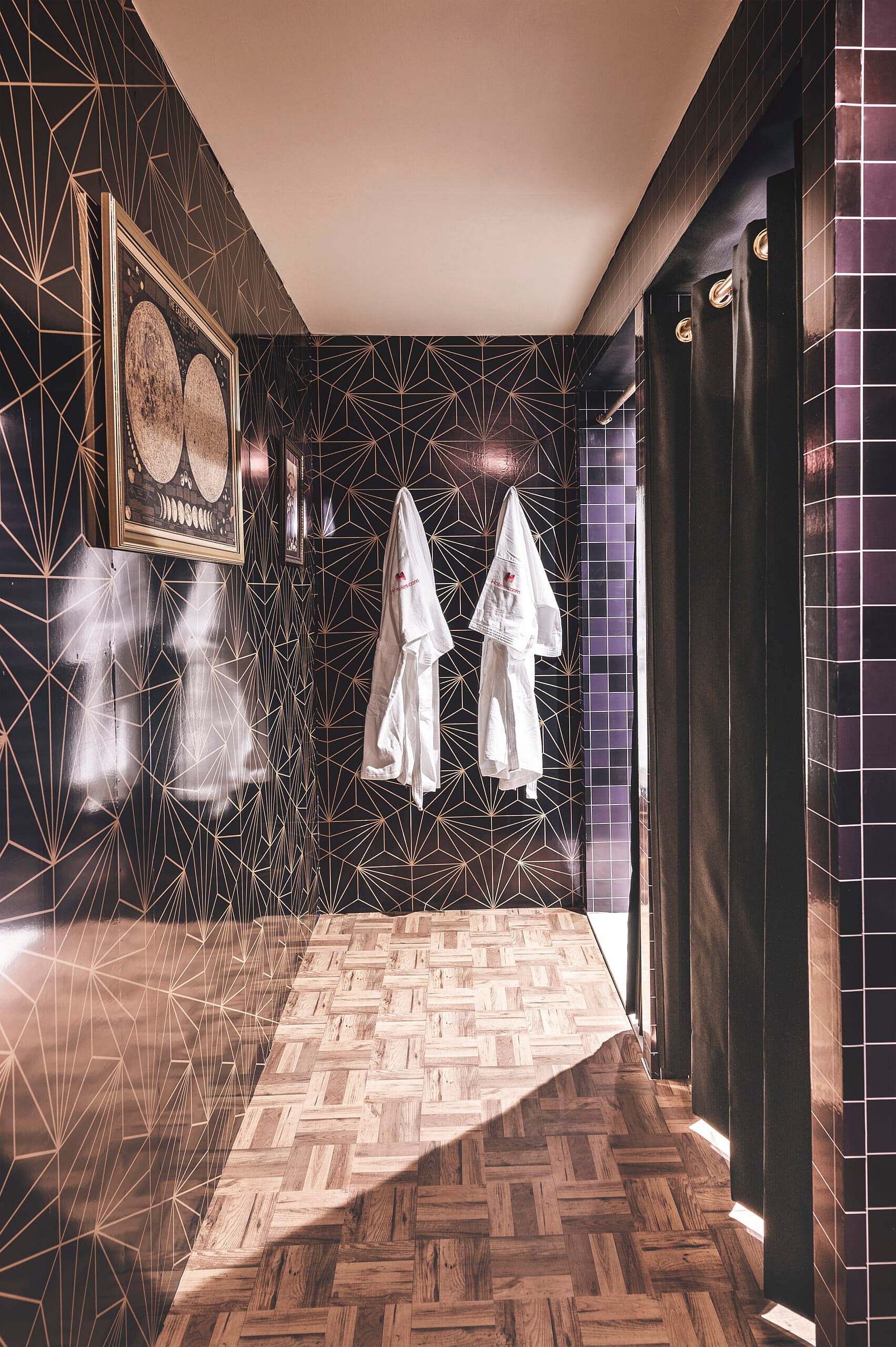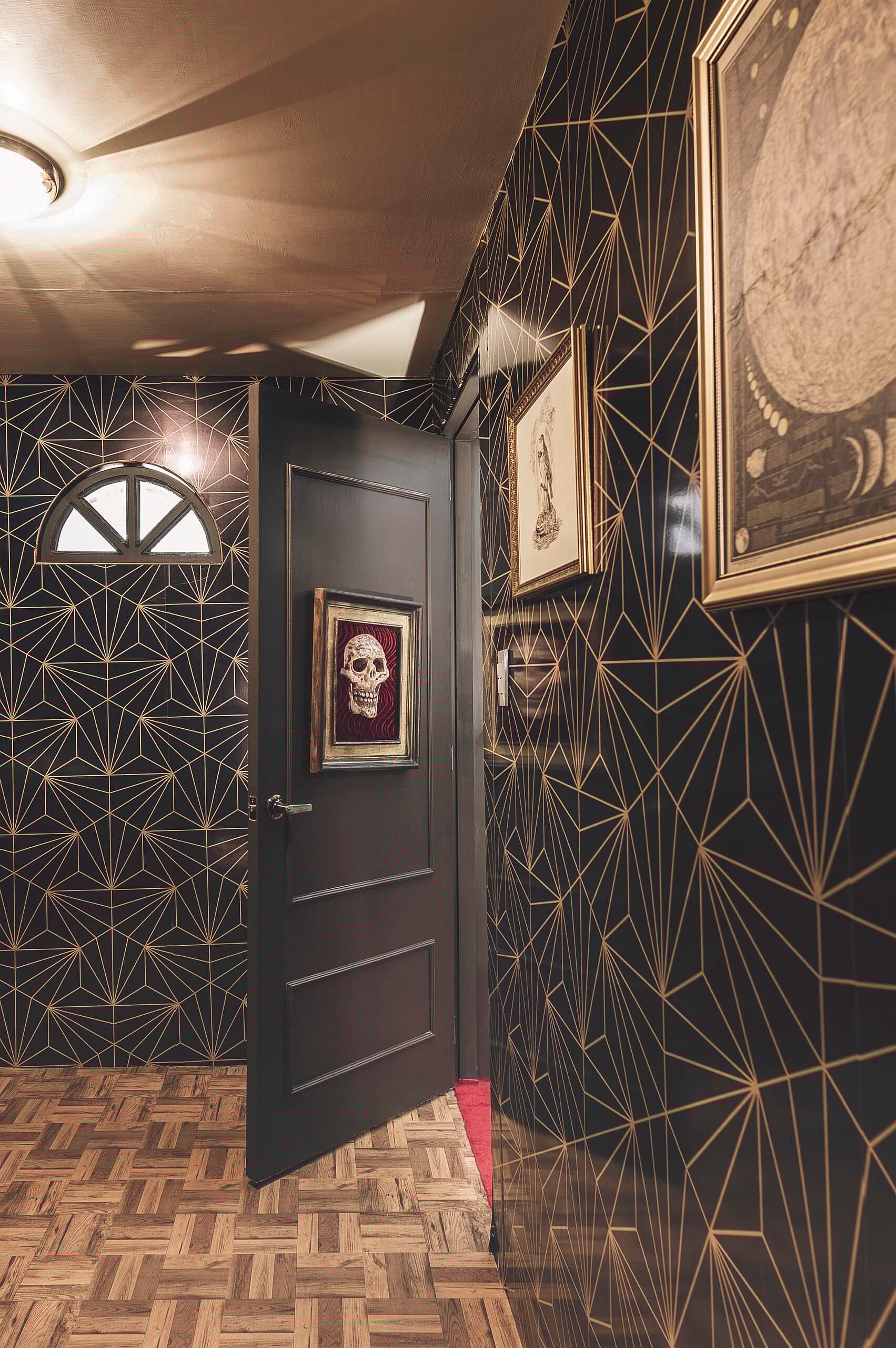 Hues of purple and black paired with the gold art deco pattern on the wallpaper create a haunting yet gorgeous celestial vibe.