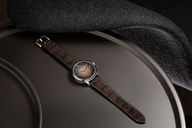 This new model brings together three of H. Moser & Cie.’s icons: the rich smoked salmon dial, the elegant Endeavour case, and the intuitive Perpetual Calendar. The dial itself features a vertical griffé finish that creates a vibrant, almost mineral-like texture. This finish, combined with the brand’s signature fumé effect, makes the color shimmer with subtle reflections ranging from soft copper to warm brown. This tasty smoked salmon hue is a nod to timeless vintage elegance in a modern timepiece.