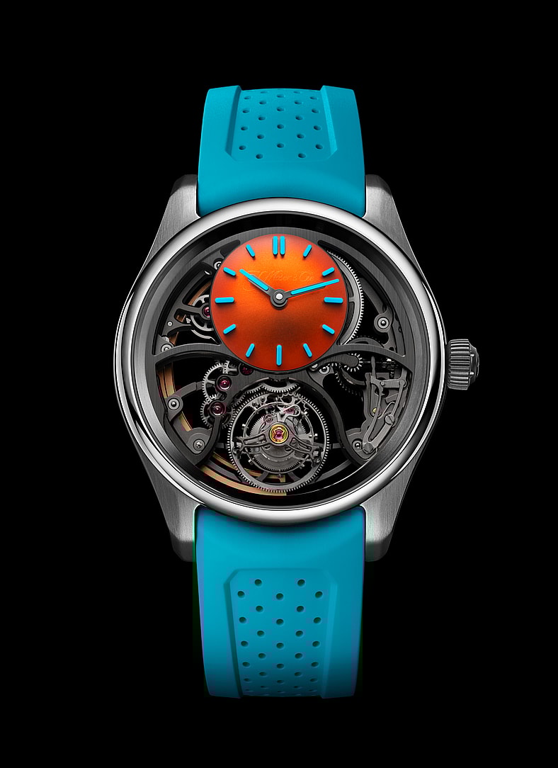 The Pioneer Tourbillon Spiced Aqua, with its flamboyant orange dial and turquoise strap, imposes its rhythm with the HMC 805 automatic Manufacture caliber, featuring an original double hairspring. Meanwhile, the Pioneer Centre Seconds Spiced Aqua, showcasing a striking turquoise fumé dial and white rubber strap, embodies effective simplicity powered by the HMC 201 automatic caliber.