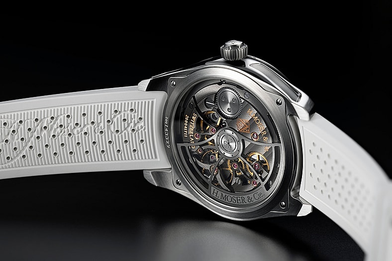 Flipping the Sunny-Side Up over reveals the beating heart of this egg-themed creation: an in-house HMC 201 automatic movement, which boasts a three-day power reserve. The bi-directional pawl winding system efficiently replenishes power, while the proprietary Straumann hairspring guarantees the artful precision that H. Moser is renowned for. The movement is finished with an anthracite treatment featuring distinctive double stripes and partially skeletonized bridges.