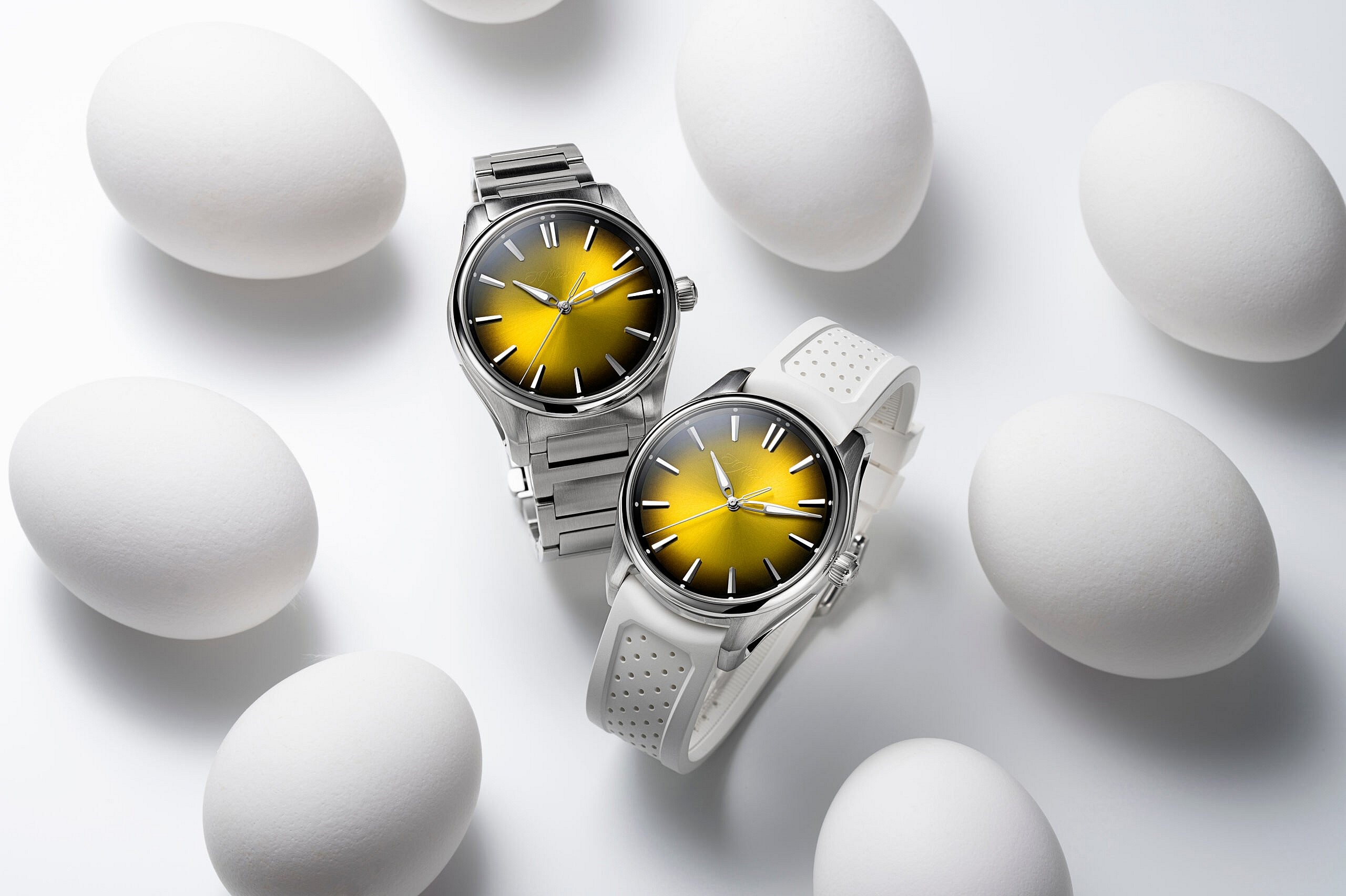 H. Moser & Cie. is scrambling the watch game with its Pioneer Centre Seconds Sunny-Side Up, an egg-inspired timepiece that serves up an omelette’s worth of whimsical details. The Sunny-Side Up notably features a vibrant yellow fumé dial, Moser’s signature gradient treatment, which bathes the watch face in a sunburst glow reminiscent of a perfectly cooked yolk. The dial is further complemented by faceted appliqué indices and lume-filled hour-markers for heightened readability even in low-light settings.