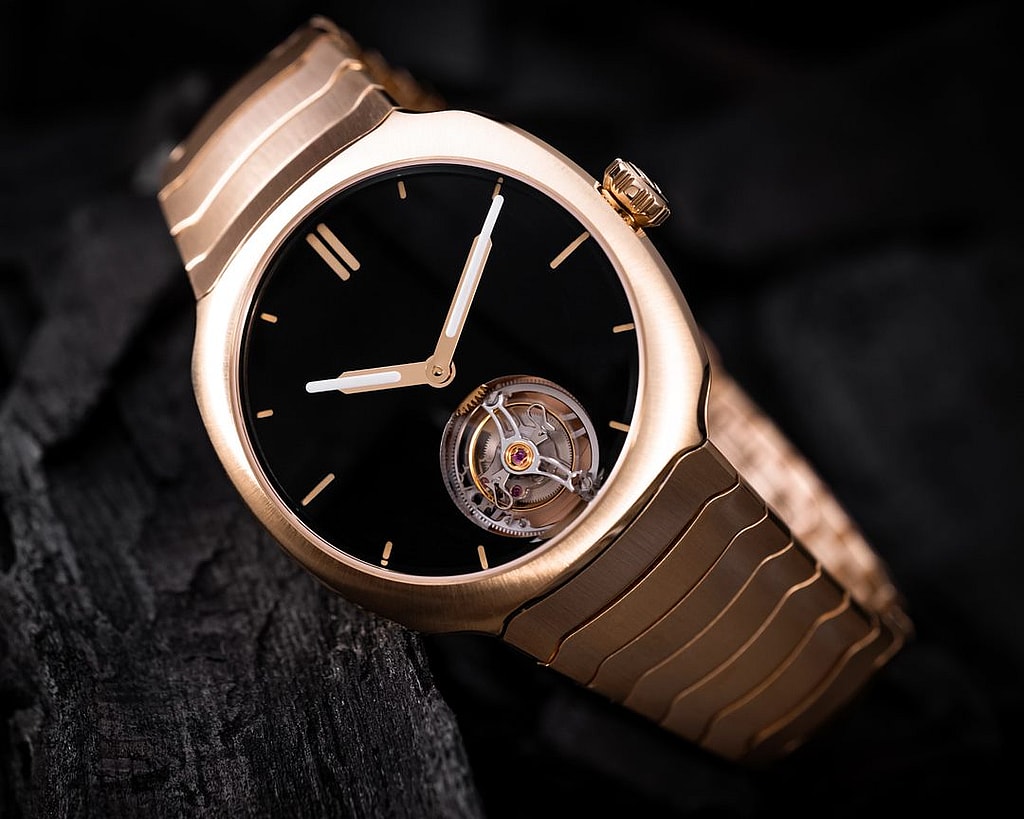 Vantablack is a modern material (formed in 2012), believed to be the darkest substance in existence — it’s precisely the reason why the 5N red gold indices and integrated bracelet stand out so handsomely.