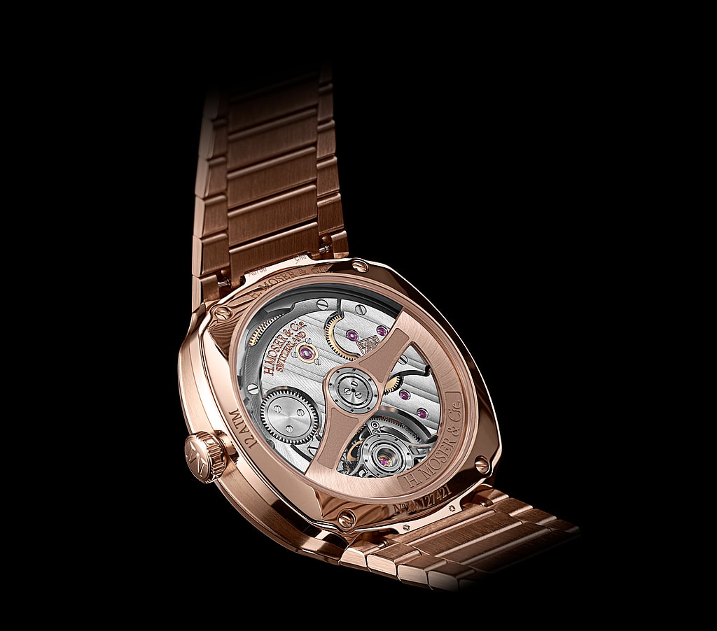 The inner complexities of the in-house movement (produced by H. Moser’s sister company) are visible through the crisply designed, intricate caseback.