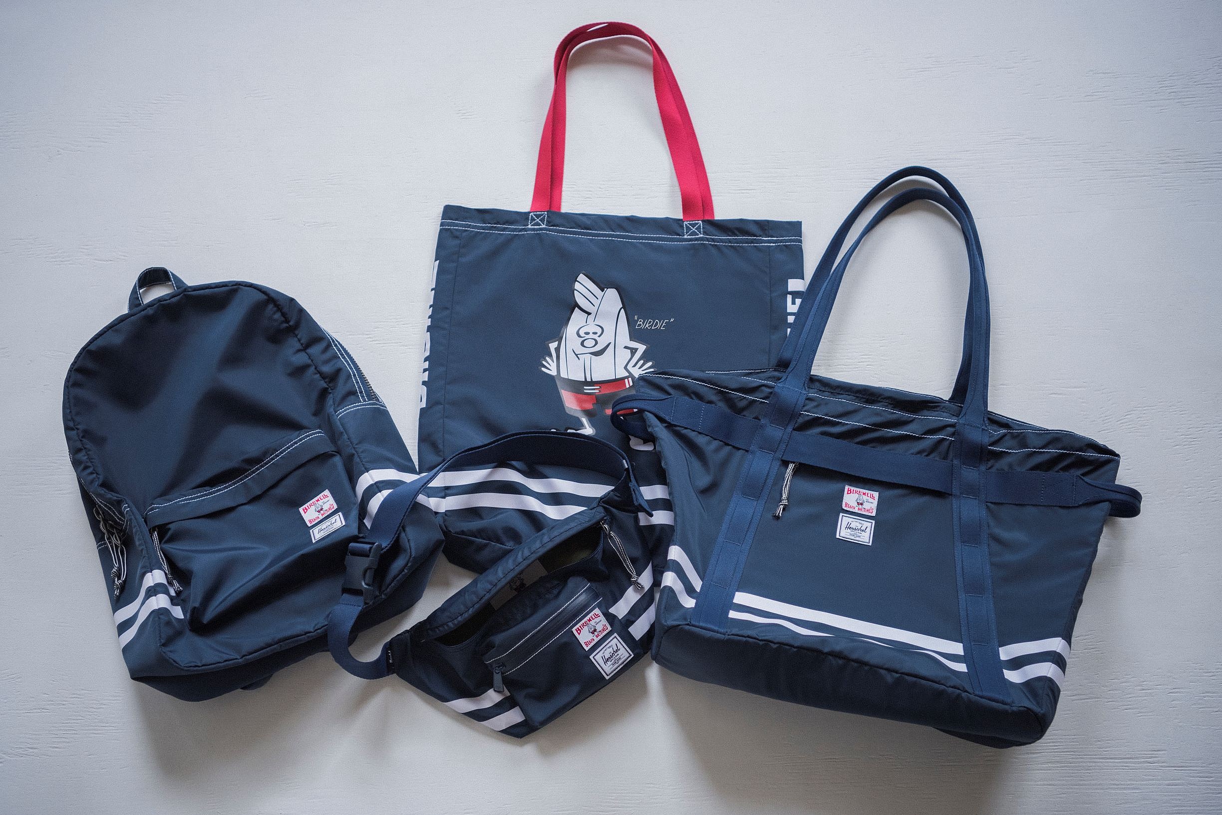 The partnership is tinged with a blend of modern and retro style throughout, including the prominent use of classic Birdwell Navy colorways, white stripes and Herschel’s modern white woven label.