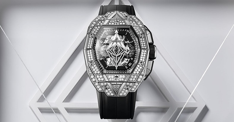 The Spirit of Big Bang Sang Bleu features “geometric tattoos” that alternate and overlap from the case to the bezel—the focal point is a 3D diamond formed by several layered triangle and pyramid shapes.