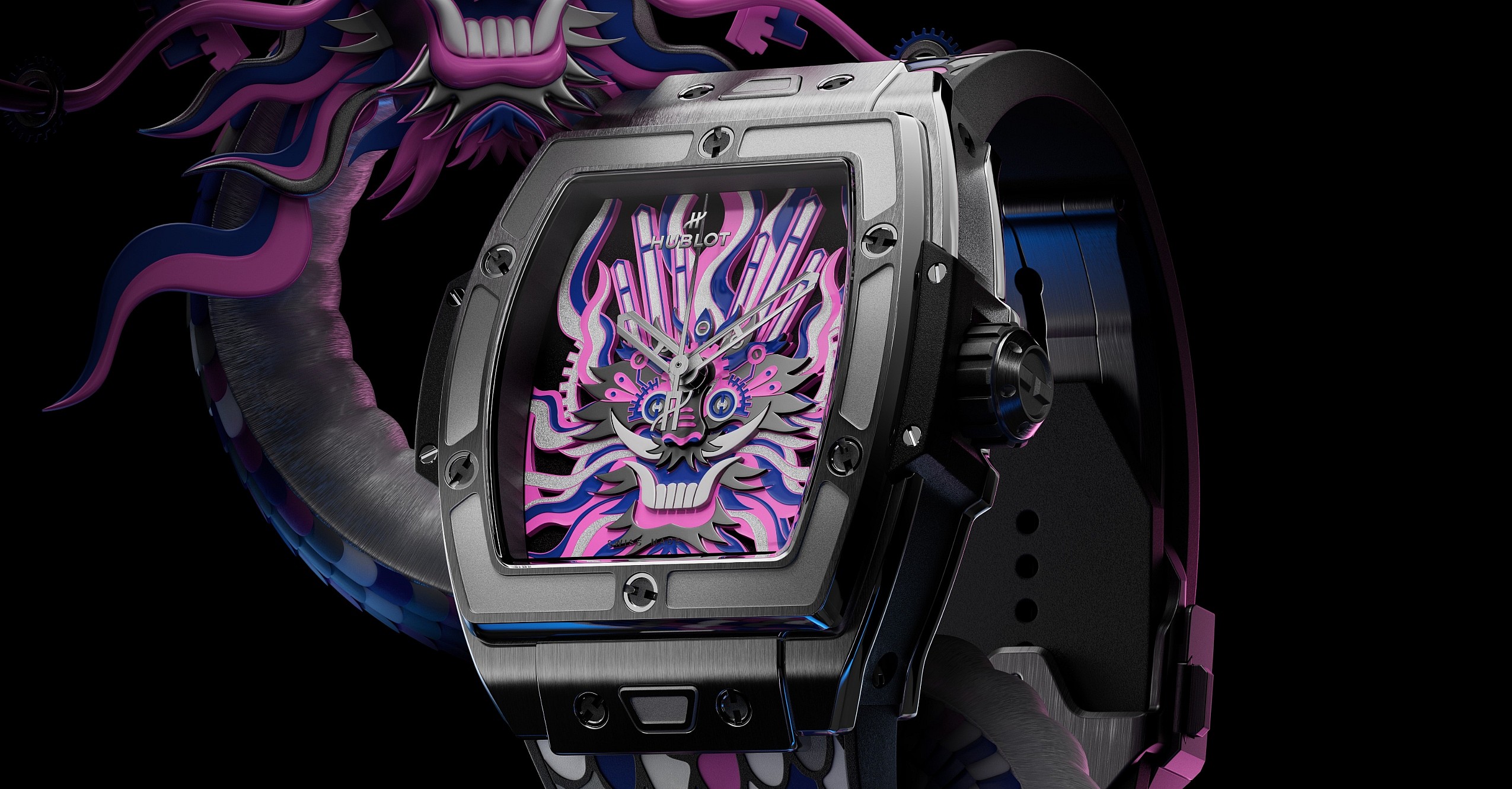 Hublot then transposed the paper-cut design into a multi-level dial construction, overlaying a base panel with several levels of appliques. The dragon’s head is made up of five layers that alternate between hands, wheels and H-shaped screws, all of which combine to create a striking 3D visage of an eastern dragon. Meanwhile, the rubber strap is adorned with pink, gray, purple, blue and white vulcanized rubber dragon scales—each hand-applied over an eight-hour process.