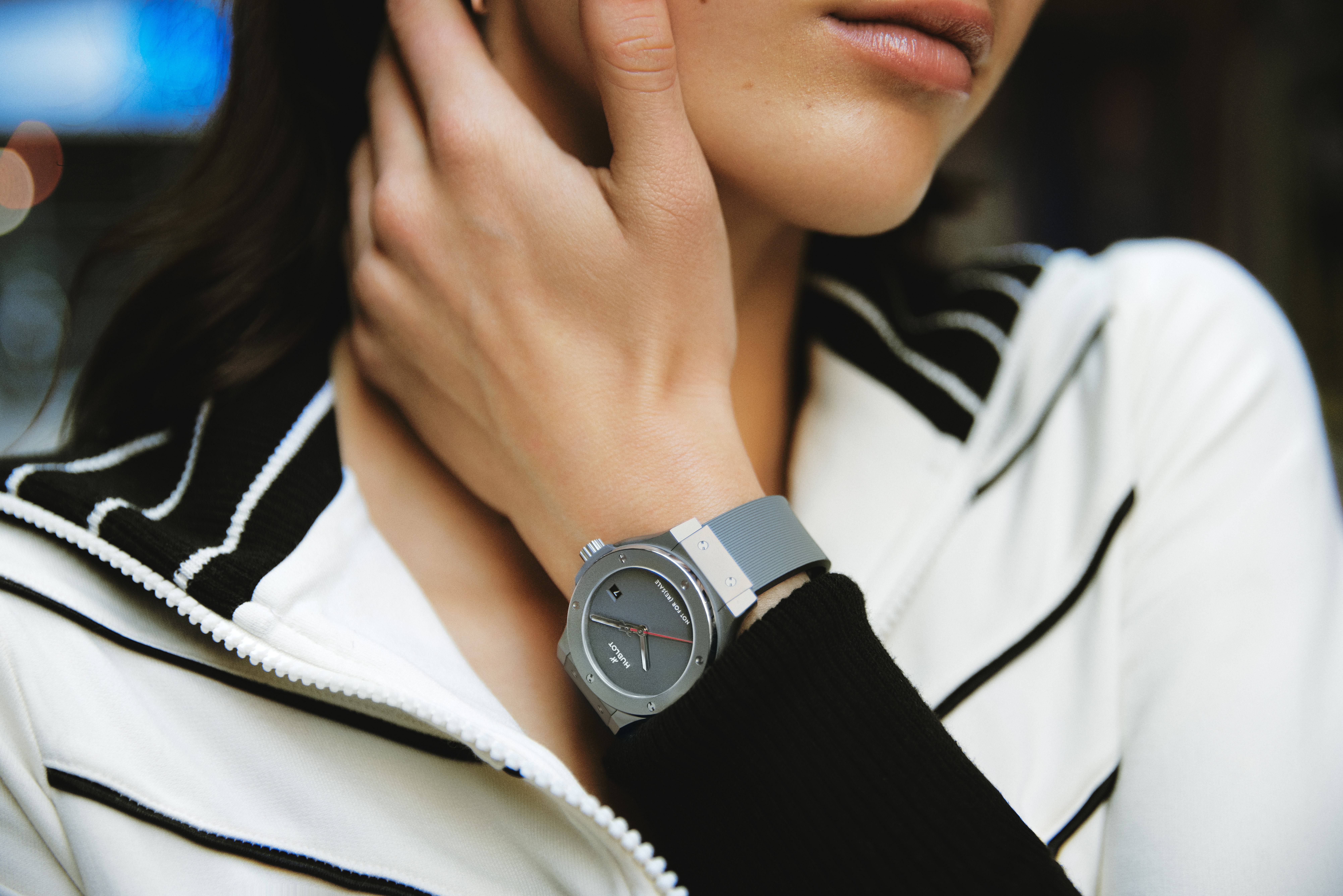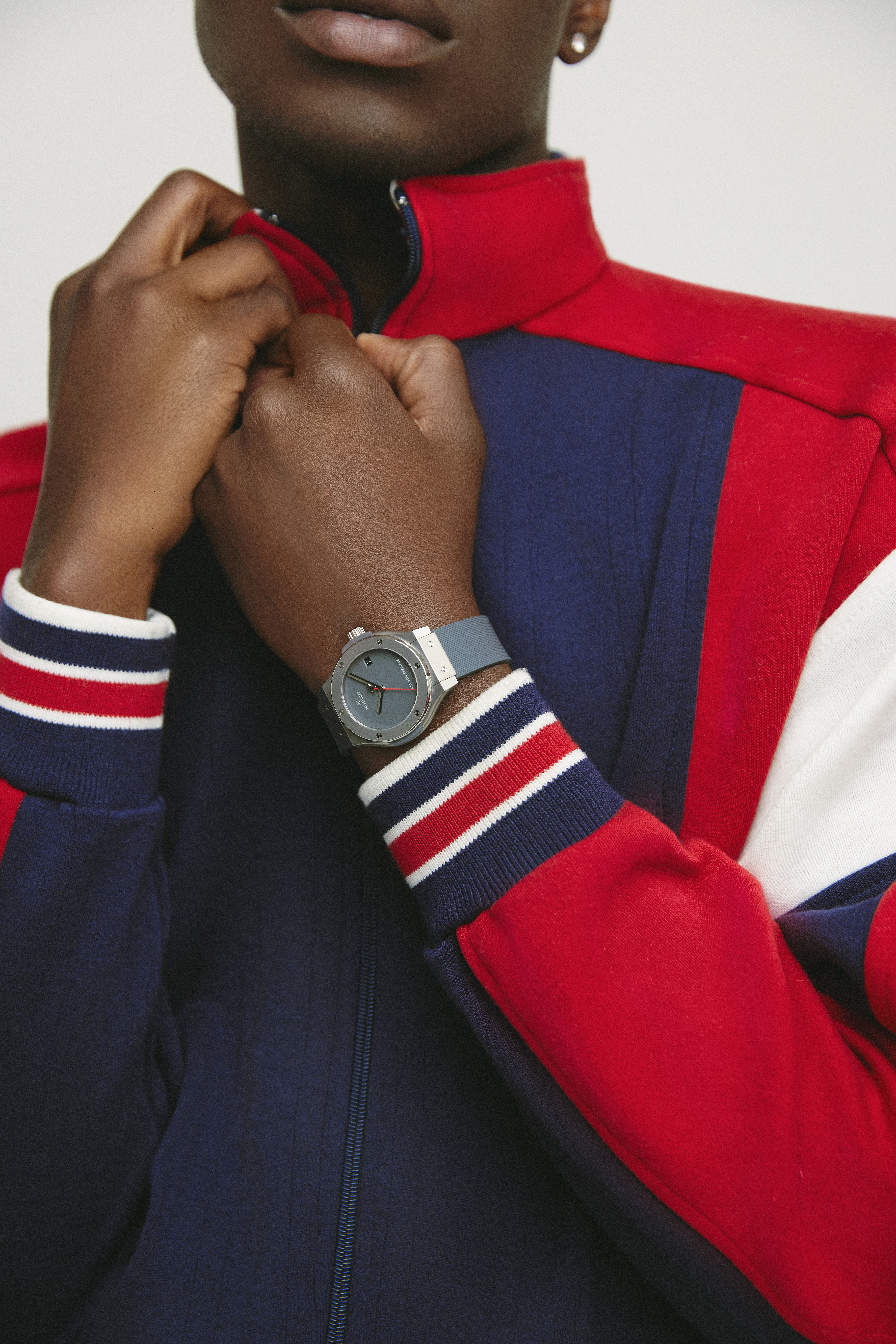 Hublot and Hodinkee stuck closely to the original Atelier Watch in terms of design, updating its look with a monochromatic grey dial and rubber strap.