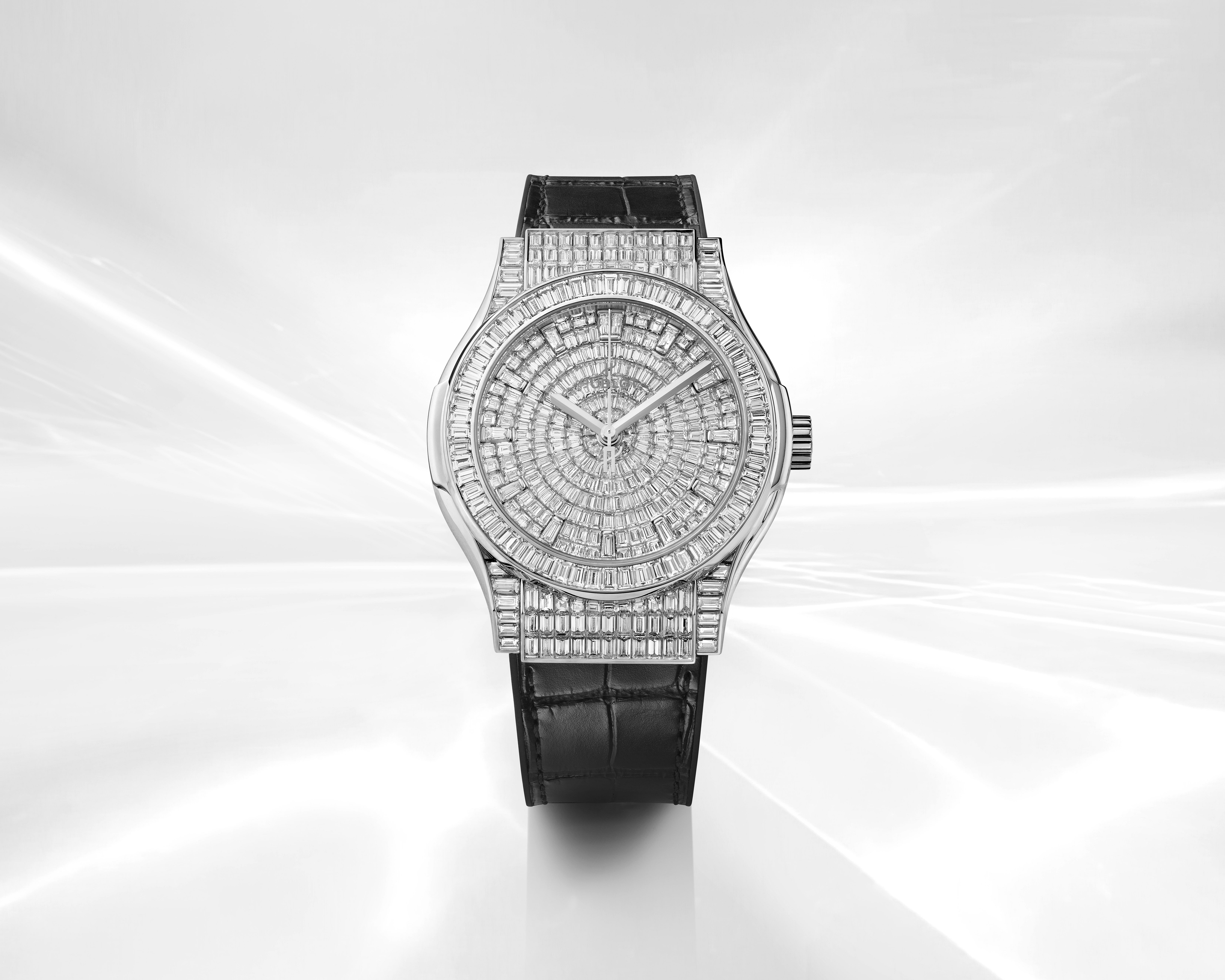 Joining similarly icy renditions of Hublot’s Big Bang, Spirit of Big Bang and Square Bang Unico, the new Classic Fusion High Jewelry 42mm bedazzles one of the most pared down designs in the brand’s lineup.