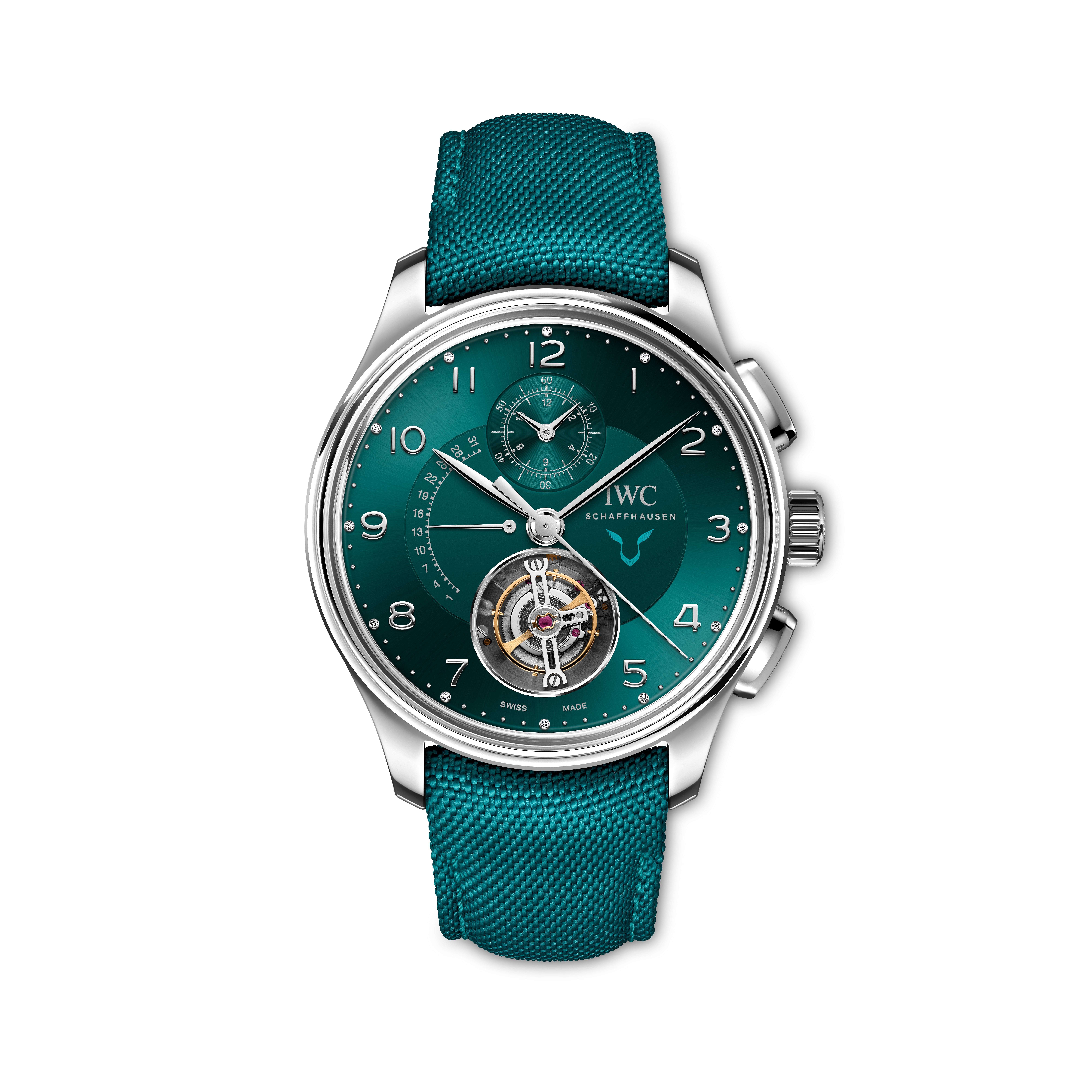 Central to the watch is an eye-catching teal dial and teal textile strap, but the details underneath the hood, so to speak, of this IWC timepiece are equally important.
