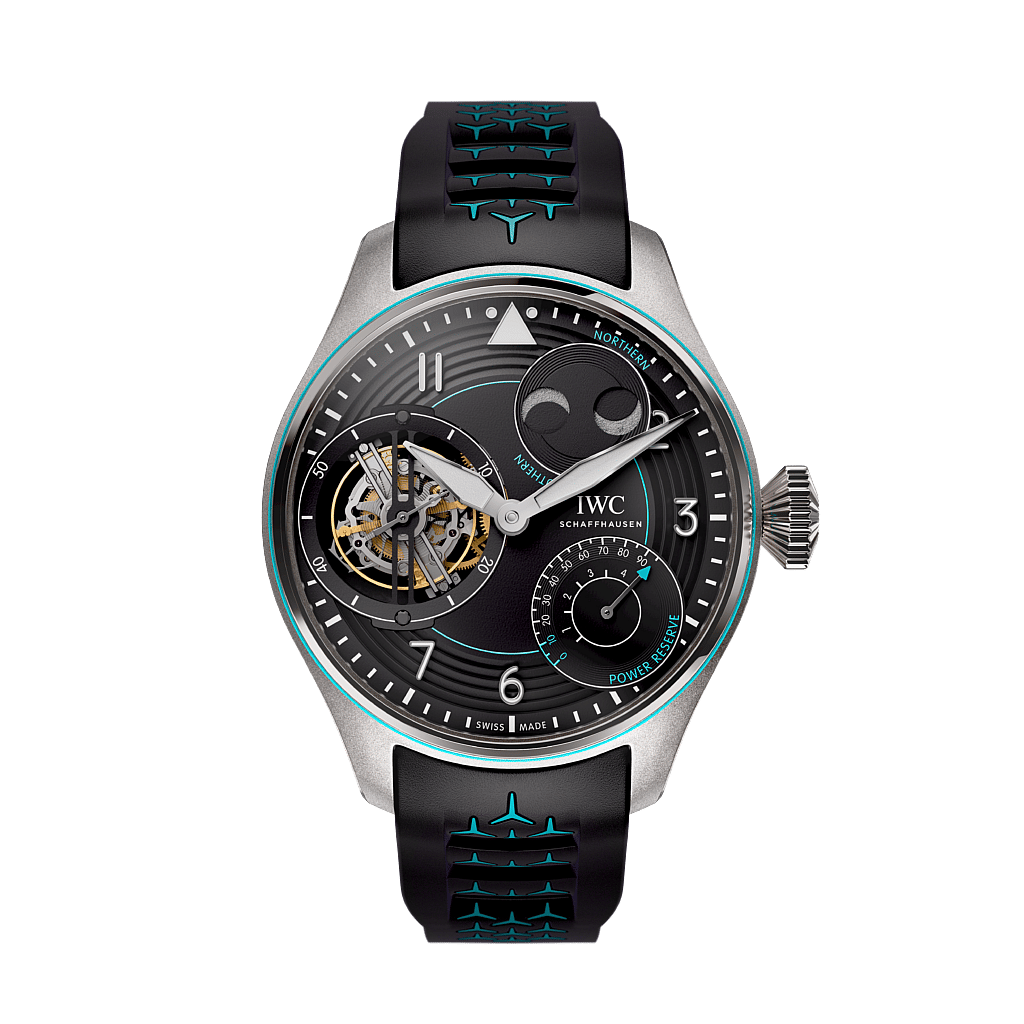 Structurally, the technical timepiece employs two high-tech titanium alloys. The case back is Ceratanium, an IWC-developed material that’s light and rigid like titanium but as hard and scratch-resistant as ceramic. The case is made of titanium aluminide (TiAl), which is lighter and harder than conventional titanium, highly resistant to corrosion, and biocompatible. The material is used for turbine blades of modern jet engines, as it’s extremely heat-resistant.